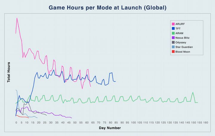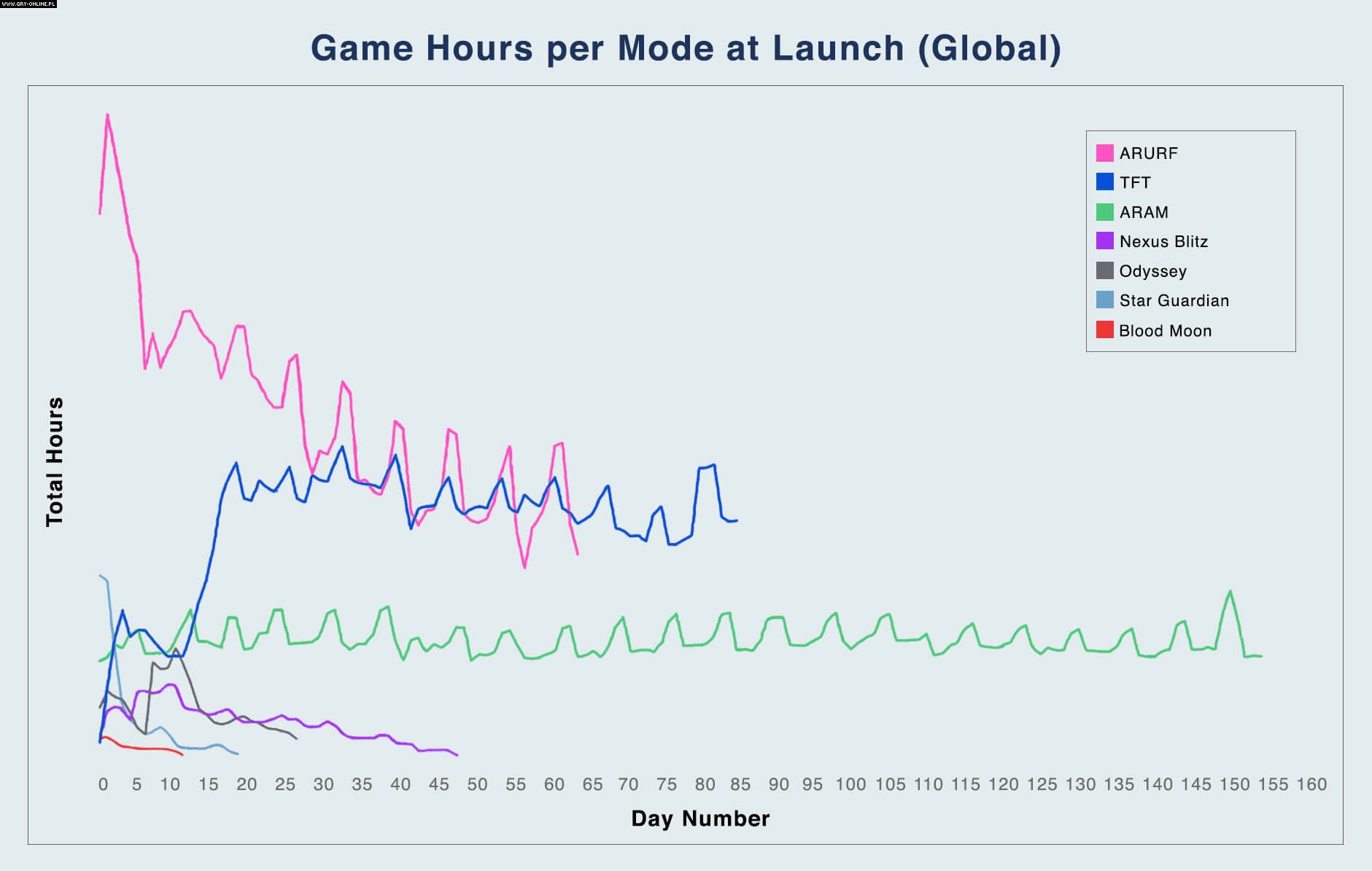 W dalszej części wpisu Riot Games przedstawia również, jak dużą popularnością cieszy się Teamfight Tactics. Każdego miesiąca w grze bawią się 33 miliony graczy, a liczba ta stale rośnie. Obecnie użytkowników League of Legends jest o 30% więcej niż przed premierą nowego trybu, a spora ich część pochodzi z Chin, gdzie całkowita ilość rozgranych godzin wzrosła o 35%. Na przedstawionym poniżej wykresie można również zobaczyć, ile czasu w grze spędzają gracze każdego dnia (dla porównania przedstawiono statystyki pozostałych trybów League of Legends).