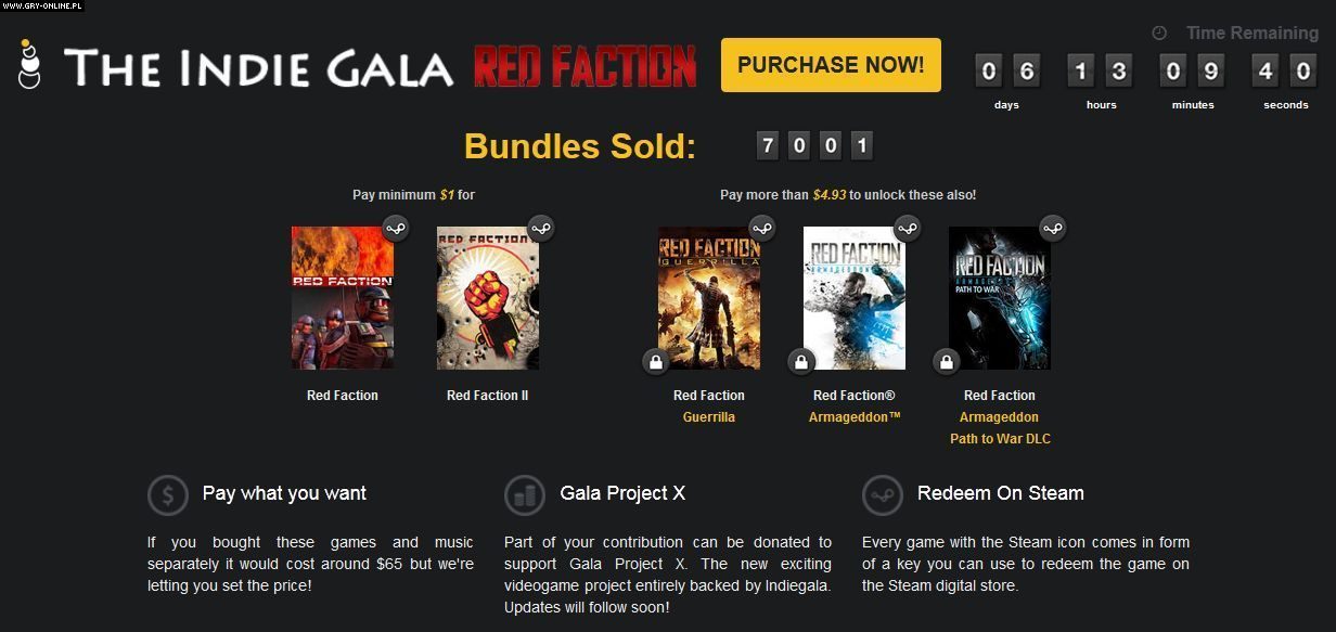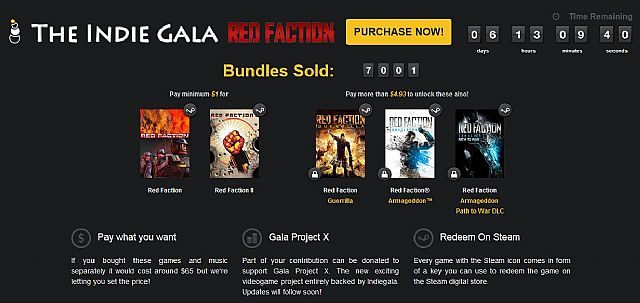 Wpłacając minimum jednego dolara (ok. 3 zł), otrzymacie kody pozwalające na odblokowanie w serwisie Steam gier Red Faction oraz Red Faction II. Z kolei jeśli na zakup przeznaczycie kwotę powyżej średniej widocznej na oficjalnej stronie akcji (obecnie 4,93 dolary, czyli ok. 15 zł), wtedy dodatkowo dostaniecie też Red Faction: Guerrilla, Red Faction: Armageddon oraz dodatek DLC Path of War do Red Faction: Armageddon.