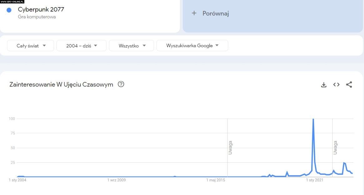 No dobra, nie tak spektakularny jak na poniższym wykresie, ale w gruncie rzeczy dość podobny. Machina marketingowa Cyberpunka 2077 była ogromna i cały hype związany z grą w dniu premiery przebił sufit, więc już chyba po wsze czasy najwyższy pozostanie słupek z grudnia 2020 roku. Ale drugi najwyższy wynik? A jakże – odnotowany został blisko premiery serialu, co też widać na wykresie.