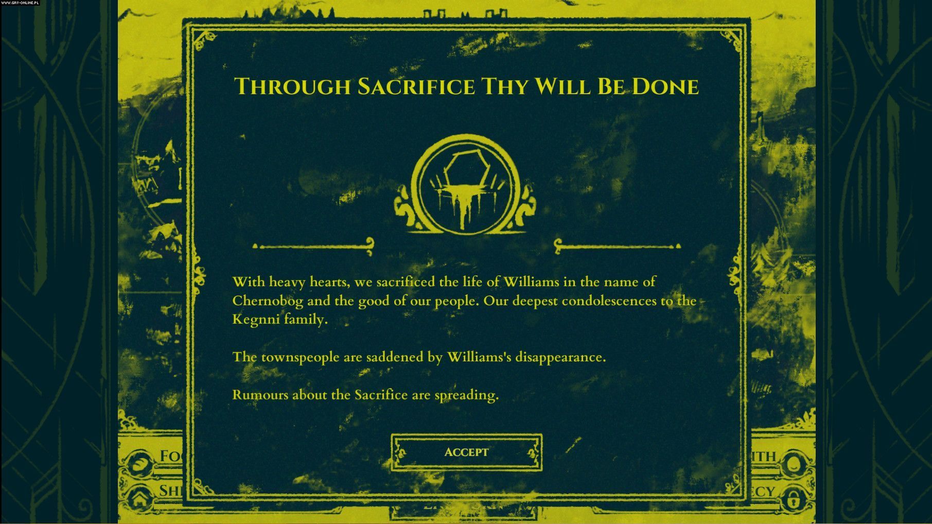 Wraz z nadejściem każdej pory roku gracz zmuszony zostanie do złożenia ofiary ludzkiej, gdyż tylko to odłoży w czasie przebudzenie bóstw. Gracz będzie musiał wtedy wskazać jednego człowieka, którego poświęci dla dobra reszty społeczności. Decyzja ta zazwyczaj okaże się mieć istotne skutki, gdyż zmieni stosunki sił między rodzinami, a ród, z którego pochodzi ofiara, stanie się bardziej nieposłuszny i wzrośnie ryzyko jego rebelii.