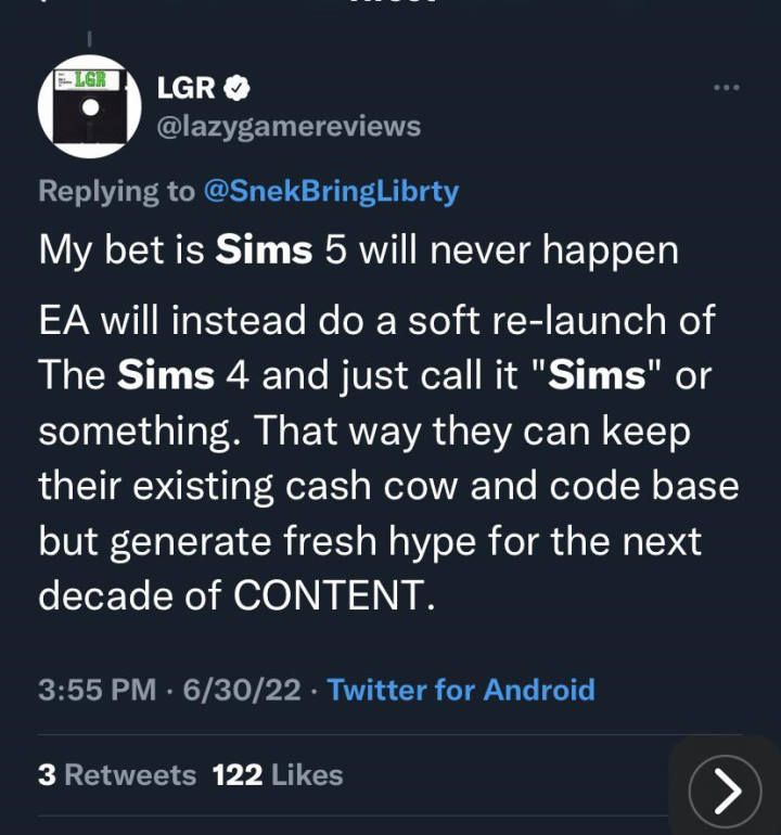Temat The Sims 5 pojawia się od czasu do czasu wśród społeczności „symulatorów”. Dyskusję podsyciła wypowiedź youtubera LGR, który jest rozpoznawalną postacią w świecie retrogamingu oraz serii The Sims właśnie. Według niego piąta odsłona serii może się wcale nie ukazać.
