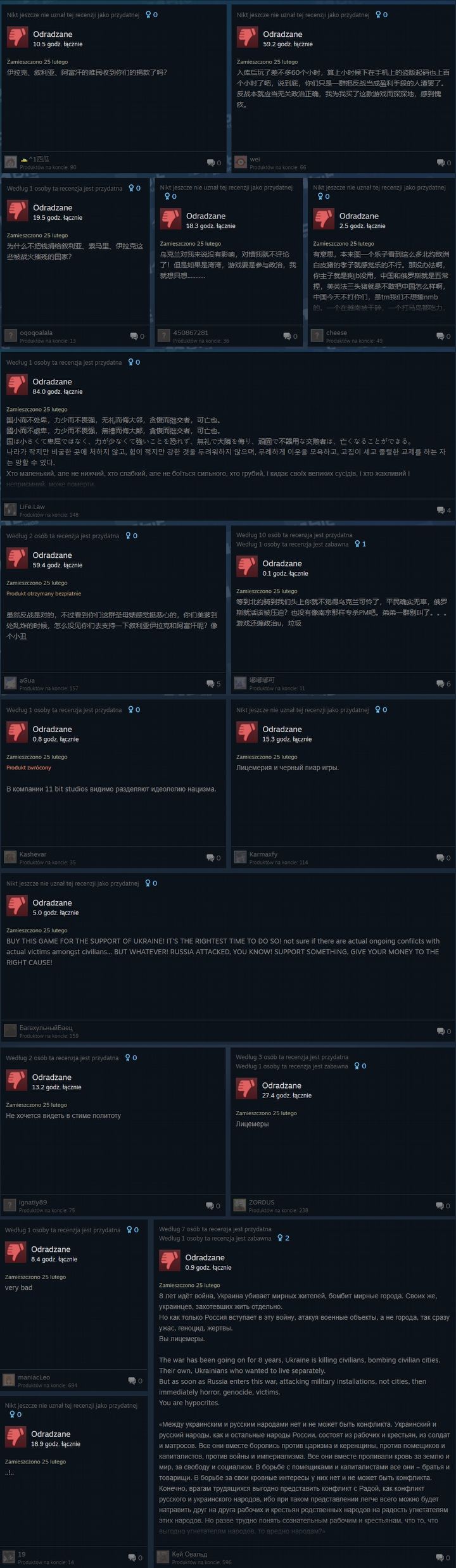 Niestety nie wszyscy fani elektronicznej rozrywki przyjęli to pozytywnie. Gracze z Chin i Rosji rozpoczęli tzw. review bombing gry na platformie firmy Valve. Ich „recenzje” – napisane dopiero teraz, nierzadko po kilku bądź kilkudziesięciu godzinach „zabawy” – zwykle nie odnoszą się, oczywiście, do tego, co oferuje ten zawierający antywojenny przekaz tytuł, a mieszają politykę z grami wideo. Warto zaznaczyć, że opinie odnośnie sytuacji na świecie bywają też wyrażane w pozornie pozytywnych komentarzach.
