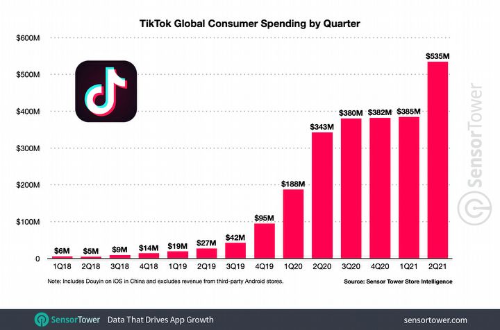 Należy podkreślić, że na ten rezultat składają się liczby ściągnięć TikToka z Google Play, App Store, a także pobrania Douyin, czyli wersji przeznaczonej wyłącznie na rynek chiński. W drugim kwartale 2021 roku aplikacja firmy ByteDance zanotowała duży wzrost wydatków konsumenckich - innymi słowy, uzyskała przychód w wysokości 535 milionów dolarów. Łączny dochód TikToka, licząc od debiutu programu, wynosi ok. 2,5 milarda dolarów. Jak dotąd, podobnymi zarobkami mogły poszczycić się takie aplikacje, jak Tinder, Netflix, YouTube czy Tencent Video.
