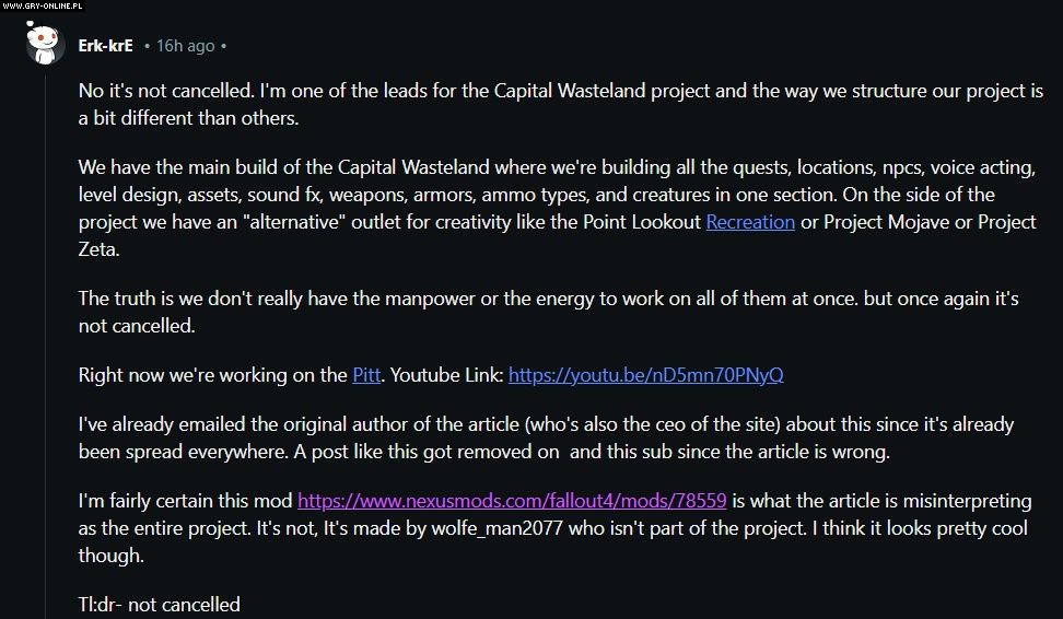 Jestem całkiem pewien, że mod https://www.nexusmods.com/fallout4/mods/78559 jest tym, co artykuł błędnie interpretuje jako cały projekt. Tak nie jest. Został on stworzony przez WolfeMan2077, który nie jest częścią projektu. Myślę jednak, że wygląda to całkiem fajnie. – stwierdził Erk-krE.