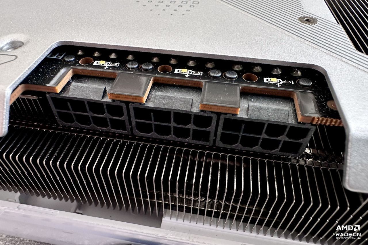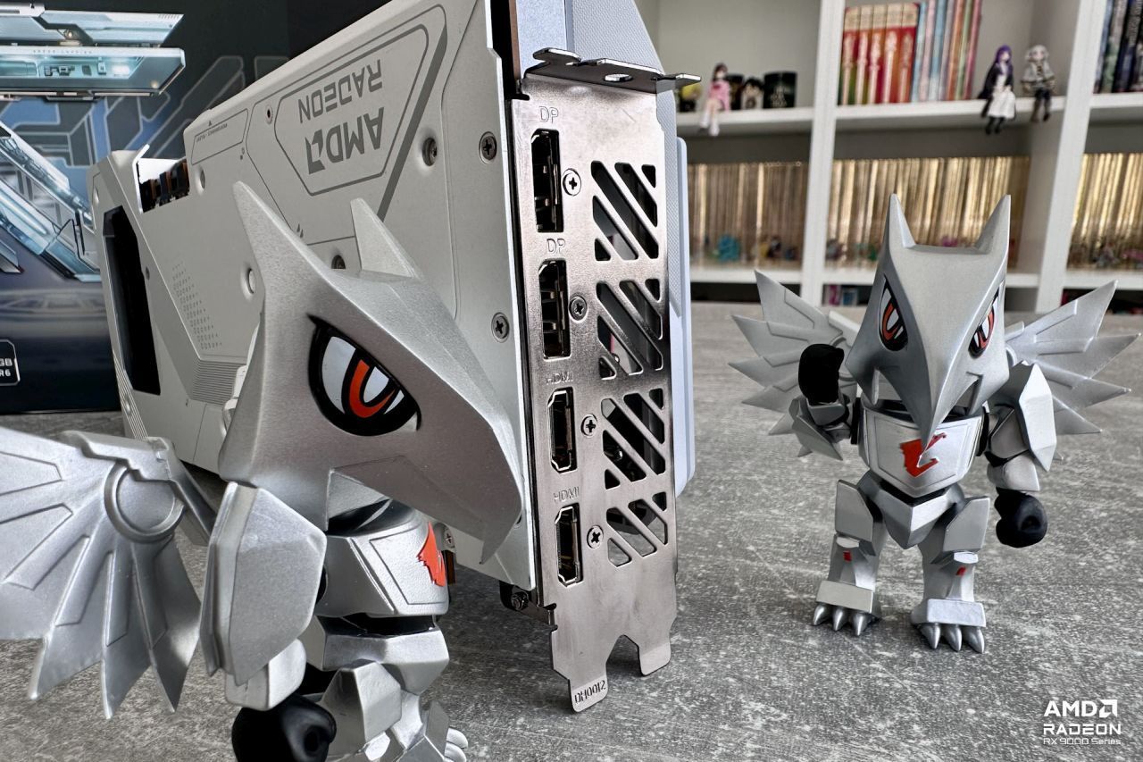 Na śledziu wyprowadzono standardowy (dla Radeona RX 9070 XT) zestaw złączy – są dwa wyjścia HDMI 2.1b (48 Gbps) oraz dwa DisplayPort 2.1a (pełne 80 Gbps). Ze wszystkich czterech złączy można korzystać jednocześnie, nawet jeżeli podłączymy monitory o bardzo wysokich rozdzielczościach (nawet 8K/60 Hz). Karta w zestawie nie posiada podpórki, ale z tyłu karty są otwory do przymocowania jej w obudowach, które przewidują tego typu montaż.