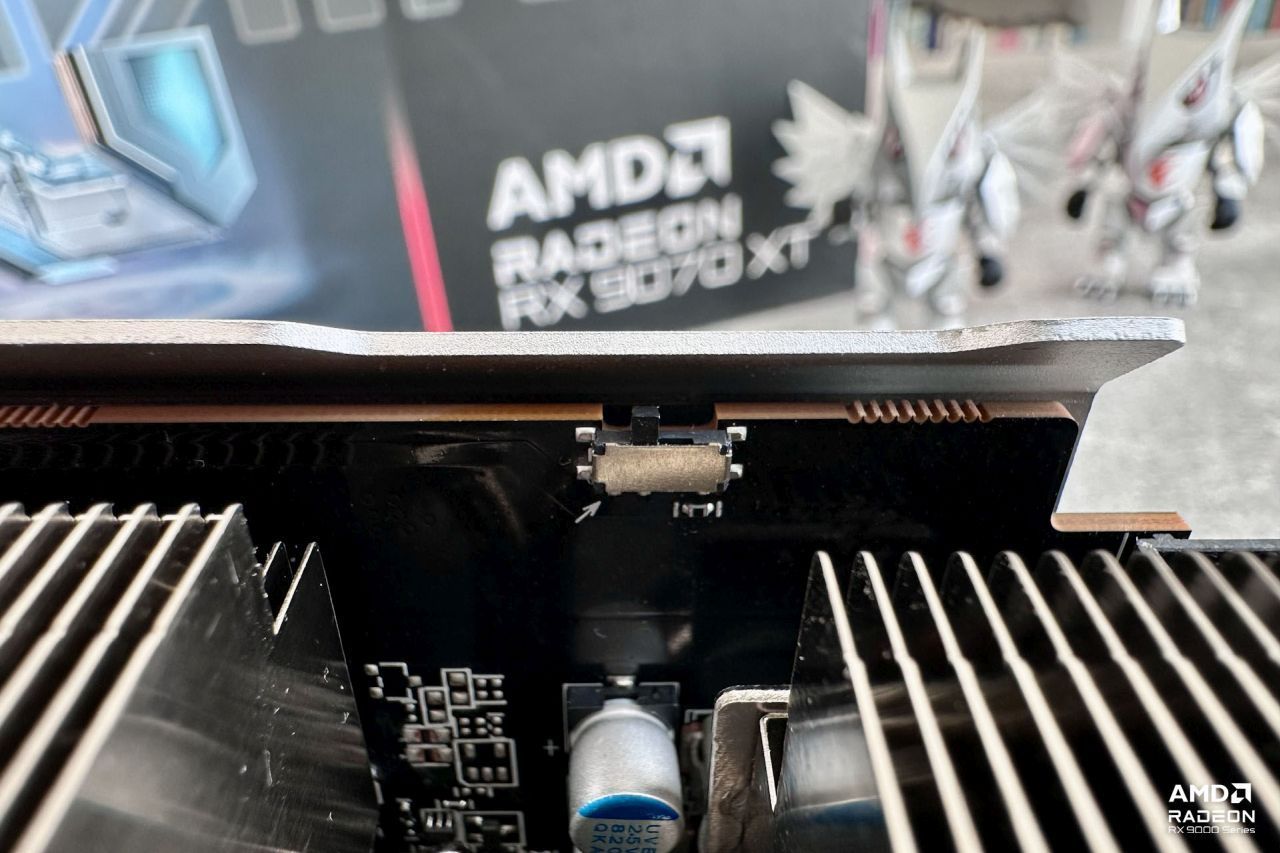 Przełącznik BIOS jest schowany pod osłoną karty, zatem nie ma opcji, aby przypadkiem coś przestawić.Źródło: własne