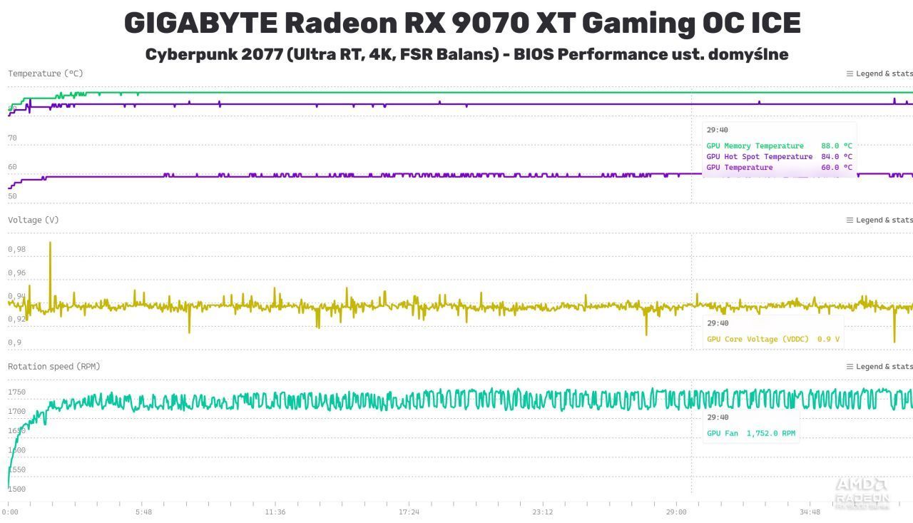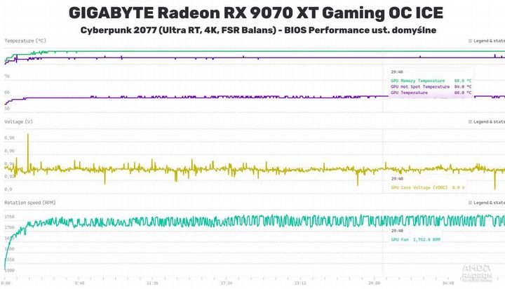 Przebieg temperatur, napięcia oraz obrotów wentylatorów w trakcie 30 minut gry w Cyberpunk 2077.Źródło: własne