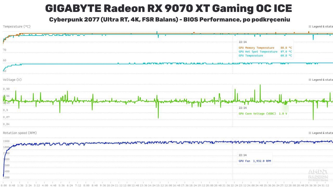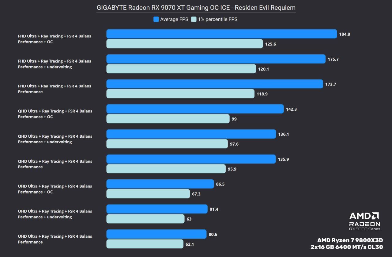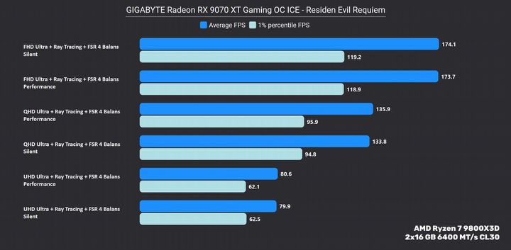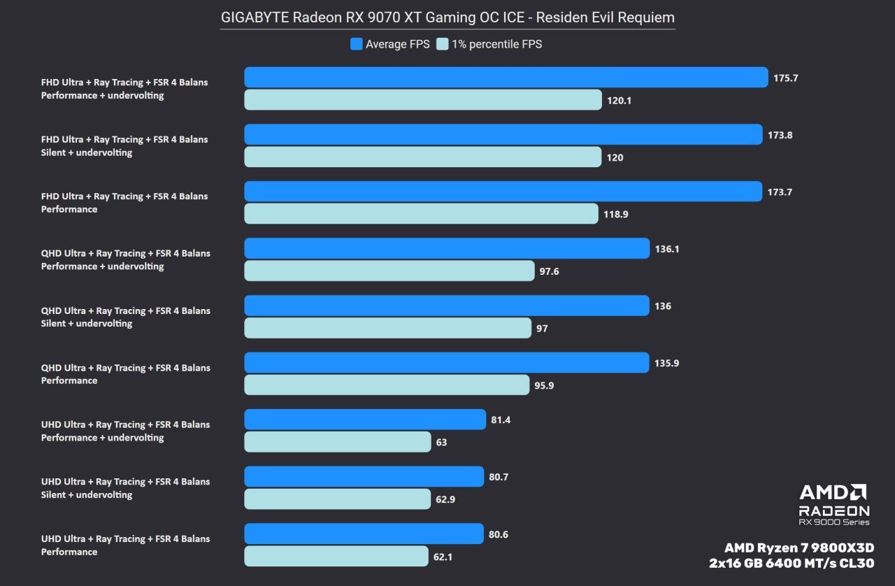 Oczywiście, jako że mamy do czynienia z Radeonem, to pierwsze co powinniśmy zrobić po zakupie, to sprawdzić potencjał undervoltingu naszej karty. AMD zwykle zbyt zachowawczo ustawia napięcia na GPU, przez co to potrzebuje więcej energii i wydziela więcej ciepła. W przypadku testowanego egzemplarza udało się obniżyć napięcie o 60 mV, co w połączeniu z obniżeniem limitu mocy o 10% w przypadku BIOS Silent spowodowało dalszy spadek prędkości wentylatorów do poziomu 25% (~1250 RPM), jako że niżej się nie da ich ustawić. Temperatury pozostały w zasadzie bez zmian. Natomiast po powrocie na BIOS Performance ten sam zabieg obniżył o 100–150 RPM obroty, zbijając je do poziomu 1500 RPM. Co ciekawe, na obu BIOSach taki undervolting, nawet mimo obniżenia limitu mocy, zaowocował wzrostem wydajności – generalnie tryb Silent po optymalizacji napięć wyprzedza standardowy BIOS Performance, a ten po optymalizacji zyskuje jakieś 2–3% na wydajności, co dobrze widać poniżej na przykładzie Resident Evil Requiem.
