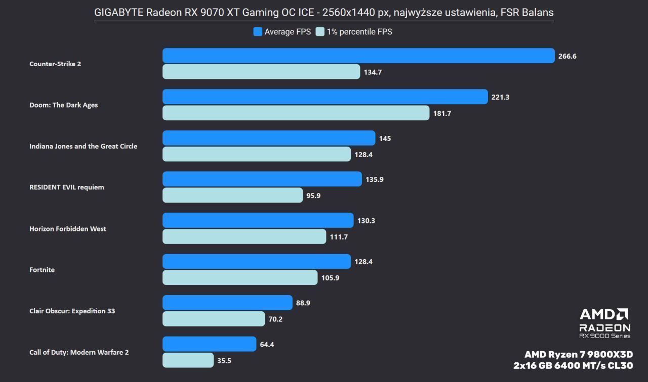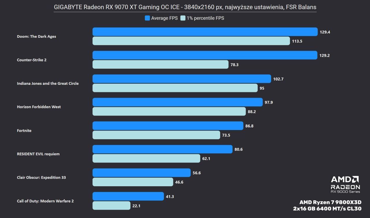Jak widać – wydajności wystarczy nawet na rozdzielczość 4K. Wyjątkiem tu jest nowe Call of Duty Black Ops, która jak na ironię jest jedyną grą, w której na ten moment (przed premierą Crimson Desert) można sprawdzić działanie AMD FSR Ray Regeneration. Jednocześnie to też produkcja, w której używanie śledzenia promieni niekoniecznie jest potrzebne (a dostępne jest tylko w trybie wieloosobowym). Zatem jest to raczej wyjątek potwierdzający regułę dotyczącą wysokiej wydajności w 4K. Pozostałe gry utrzymują poziom między 80 a 120 FPS w tej najwyższej rozdzielczości, co stanowi optymalną bazę do odpalenia generatora klatek – to technika, która z pomocą modelu AI generuje klatkę pośrednią pomiędzy dwoma renderowanymi przez silnik gry. W efekcie na ekranie mamy dwukrotnie więcej FPS, co podnosi płynność animacji, ale nieco zwiększają się przez to opóźnienia (czas od wykonania akcji, a jej wyświetlanie na ekranie). Dlatego też dobrze mieć bazowo wysoki FPS, aby z tej funkcji korzystać – wtedy wzrost opóźnień jest dużo mniej odczuwalny, a można w pełni wykorzystać potencjał najnowszych monitorów 4K z odświeżaniem 240 Hz.