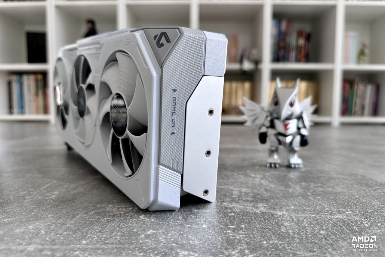 Zanim przejdę do omówienia karty, jeszcze wypada przedstawić samo GPU, o które ten model oparto. Mamy tu do czynienia z topowym przedstawicielem najnowszej generacji (RDNA 4) kart amerykańskiego producenta – AMD Radeon RX 9070 XT. Korzysta on z 16 GB pamięci graficznej oraz 64 jednostek obliczeniowych (CU). Warto podkreślić, że RDNA 4 wprowadza ogromne zmiany w wydajności dla śledzenia promieni oraz obliczeń AI – druga generacja akceleratorów macierzowych (których w tej karcie znajdziemy łącznie aż 128) pozwala wykonywać obliczenia ze zmiennopozycyjną precyzją (FP8), czego do działania wymaga oficjalne wydanie AMD FSR 4. Oznacza to, że Radeon RX 9070 XT oferuje wszystko to, czego należy wymagać od nowoczesnej karty: