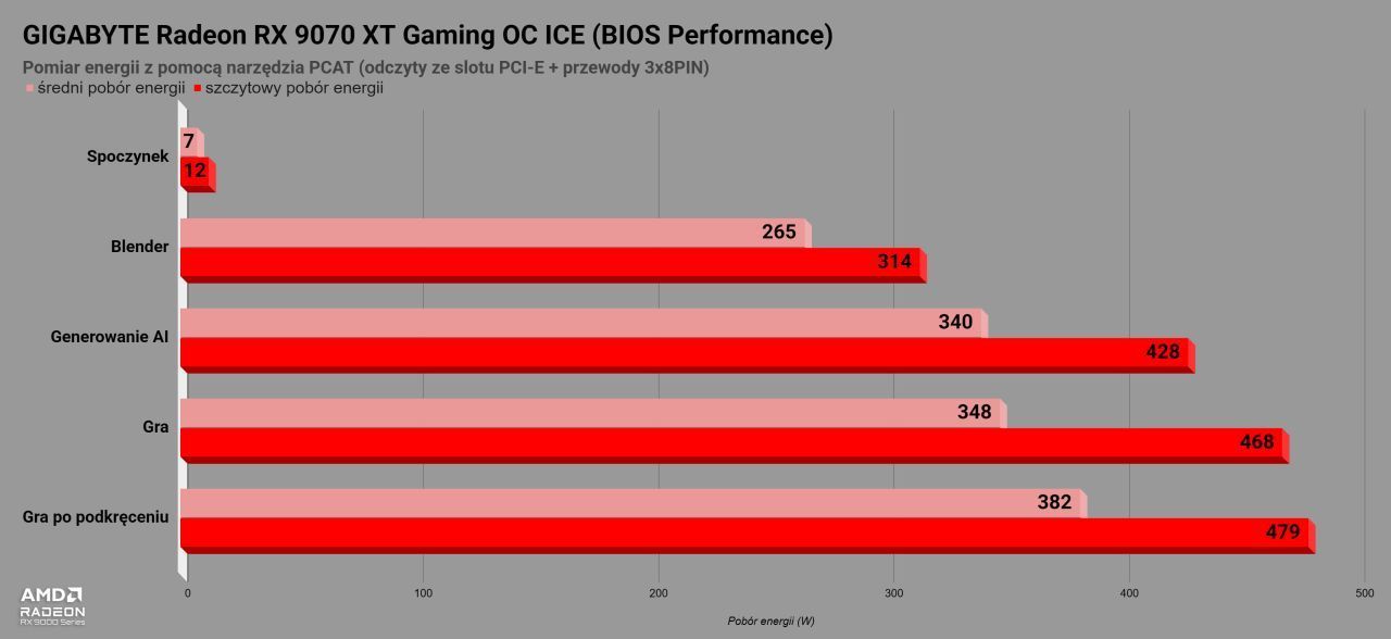 Wszystko to, co pokazałem powyżej, oczywiście nie bierze się z powietrza i karta do pracy wymaga energii – całkiem zresztą niemało, ale przy tej wydajności nie powinno to dziwić. Podczas gry na domyślnych ustawieniach oraz tym bardziej po zdjęciu limitów faktycznie wygląda na to, że zasilacz o mocy 850 W (który zaleca dobrać dla tej karty jej producent) będzie słusznym wyborem, ale wyniki po undervoltingu wskazują już na dobre o 100 W mniej mocarną jednostkę zasilającą. Nie musi być ona również najnowszej generacji ATX 3 i wyżej – karty AMD nadal dzielnie trzymają się starszych i mniej awaryjnych złączy 8-PIN, zatem nawet poczciwe, ale solidne zasilacze ATX 2.3 o mocy 750 W sobie z tą kartą poradzą. Trzeba też zwrócić uwagę na pobór energii w spoczynku – jeżeli czasem zdarza nam się zostawić „nic nie robiący” komputer, to opisywana karta prawie w ogóle nie wpłynie na jego pobór energii.