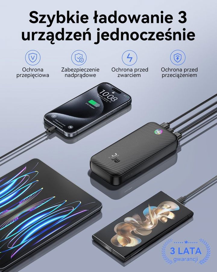 Co istotne, powerbank został wyposażony w szereg zabezpieczeń: przed przeładowaniem, przegrzaniem, zwarciem i przepięciami. Producent postawił na inteligentny system zarządzania energią, który automatycznie dostosowuje moc wyjściową do konkretnego urządzenia, chroniąc jego baterię i wydłużając jej żywotność. To nie tylko wygoda, ale i bezpieczeństwo – zarówno dla Twojego sprzętu, jak i Ciebie.