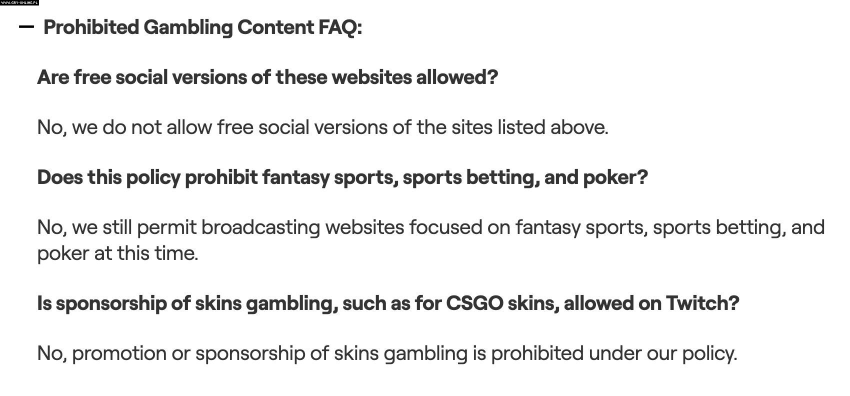 Zgodnie ze sformułowaniem zawartym w regulaminie Twitcha, ograniczenia dotyczą nie tylko demonstrowania rozgrywki na tego typu stronach, ale także wszelkich form ich promocji, w tym banerów i innych integracji. Ponadto, zakaz dotyczy nie tylko z CS:GO, ale także z innych gier. Przedstawiciele platformy streamingowej nie podali jednak przykładów konkretnych gier ani stron internetowych.