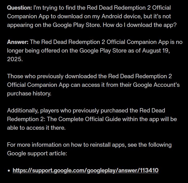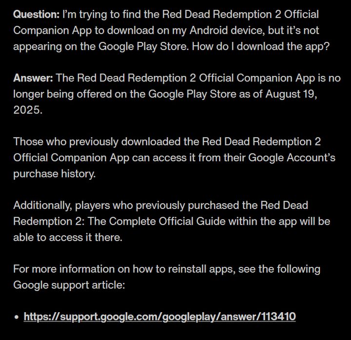 Okazało się, że 19 sierpnia aplikacja została wycofana ze sklepów AppStore i Google Play. Ten sam informator wyciągnął następnie wniosek, jakoby miało to być powiązane z domniemanymi planami odświeżenia RDR2 na PS5 i XSX/S i brakiem potrzeby dalszego jej wspierania przez Rockstar Games. Zgodnie jednak z treścią odpowiedzi opublikowanej pod postem, użytkownicy, którzy pobrali aplikację wcześniej, wciąż będą mogli z niej skorzystać. Ona sama była natomiast w użytku przez około 7 lat, od 26 października 2018 r. i pozwalała wyświetlać mapę gry na urządzeniu mobilnym.