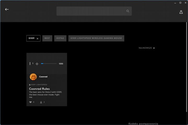 Mamy też możliwość pobierania ustawień przygotowanych przez innych graczy. Choć w chwili publikacji tekstu ogranicza się to właściwie do… jednego gracza i jego profilu dla gry Dota 2. Z czasem pewnie dojdą kolejne ustawienia przygotowane przez fanów, choć pewnie sporo użytkowników może nawet nie wiedzieć, że taka opcja istnieje.