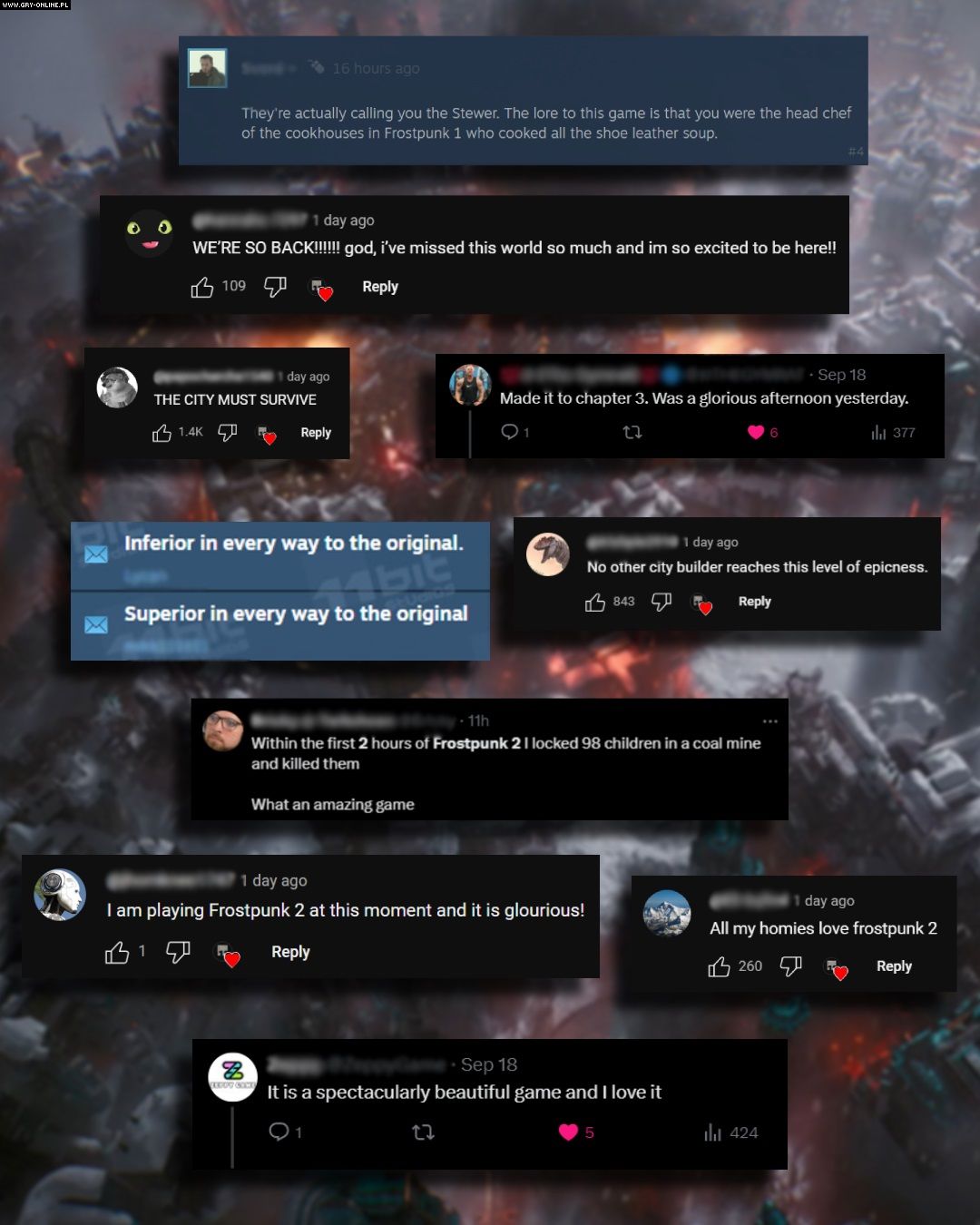 Oprócz głównego ogłoszenia twórcy Frostpunk 2 opublikowali także własne wpisy, w których odnieśli się do tej kwestii. Jak napisał Łukasz Juszczyk, reżyser i dyrektor artystyczny w studiu 11 bit, zespół zdawał sobie sprawę, że „mała osada” rodem z pierwszego FP to za mało i trzeba na nowo zbudować systemy city buildera.