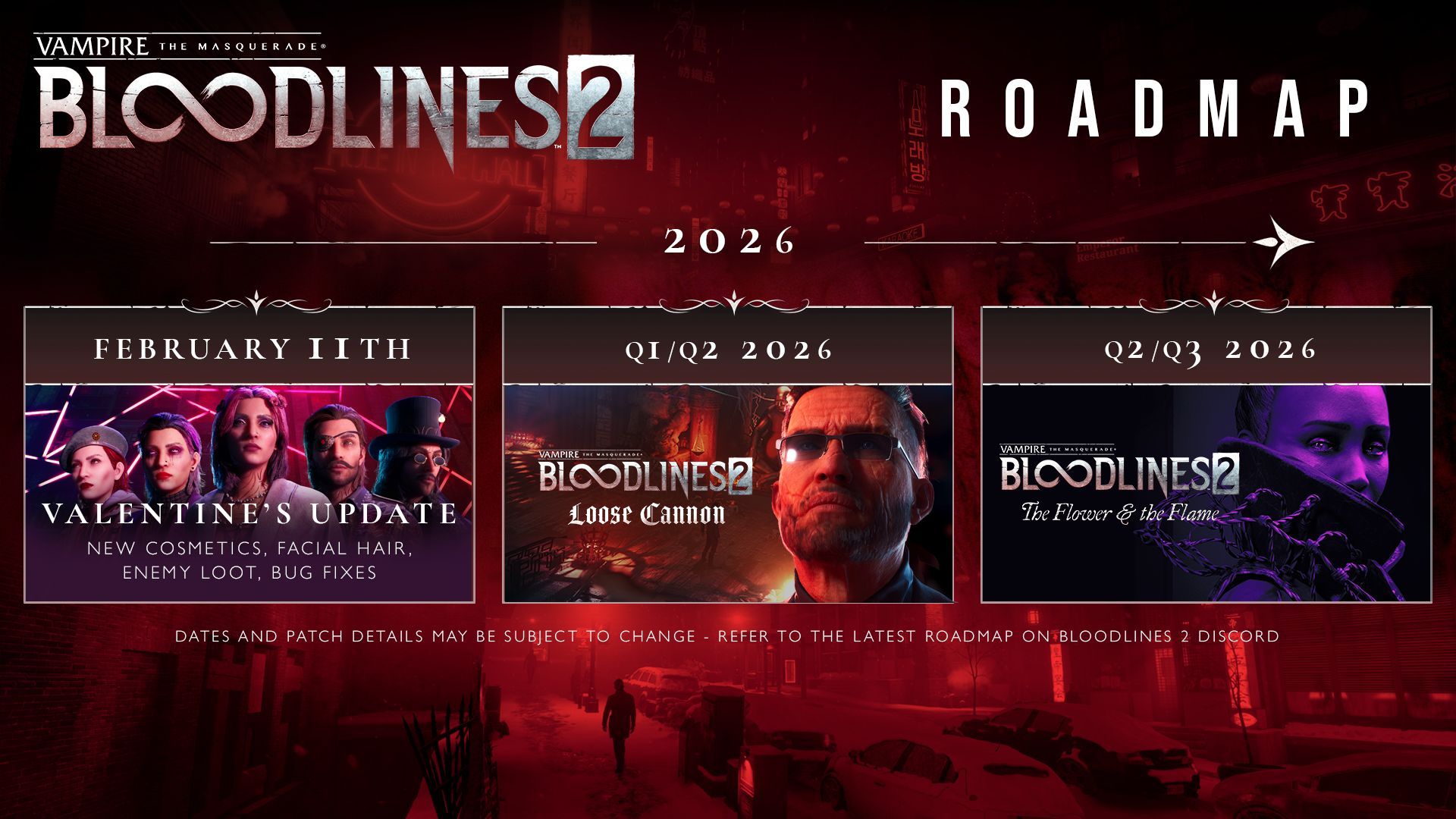 Studio The Chinese Room udostępniło na Steamie roadmapę na rok 2026, która zawiera trzy najważniejsze etapy. Pierwszym jest walentynkowa aktualizacja, której premiera zaplanowana jest na 11 lutego. Wprowadzi ona do Bloodlines 2 nowe elementy kosmetyczne, łupy z przeciwników oraz poprawki błędów.