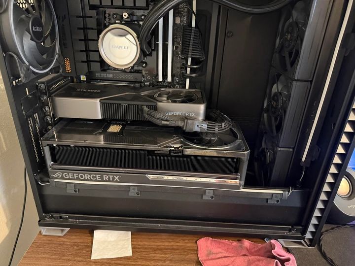Na subreddicie r/nvidia użytkownik Gallade213 porównał nowego RTX-a 5080 od Asusa ze swoim dotychczasowym 3080 Founder’s Edition (czyli premierową wersją karty bezpośrednio od Nvidii). Różnica jest kolosalna i przy nowym GPU poprzednie wygląda niczym zabawka udająca kartę graficzną. Trudno sobie wyobrazić, żeby tak wielki RTX 5080 mógł być bezpiecznie przymocowany do płyty głównej.
