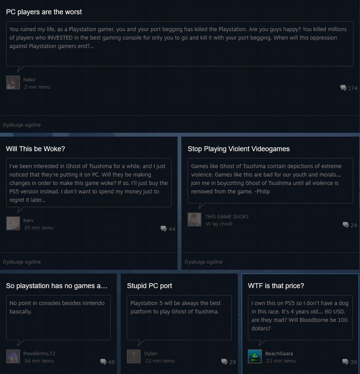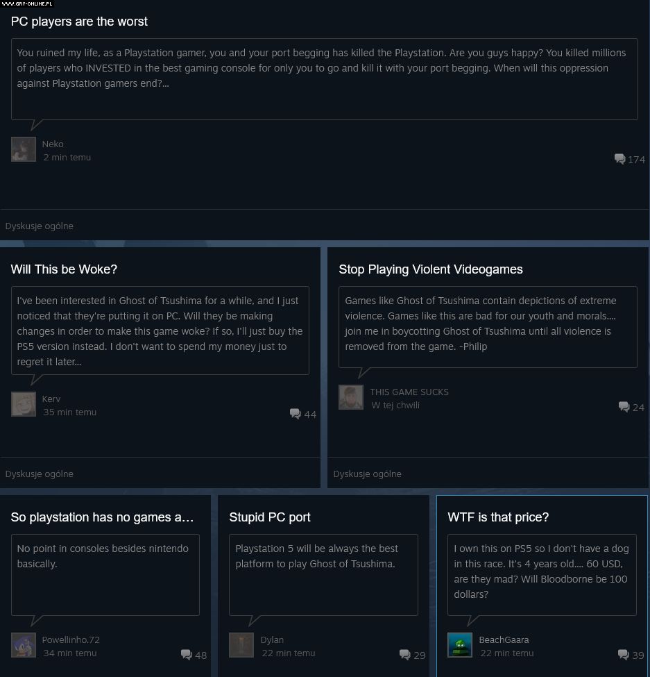 Znalezienie takich wpisów nie nastręcza żadnych trudności. Od razu po wejściu do Centrum społeczności na karcie dzieła studia Sucker Punch w serwisie Steam „uprzejmie witają” nas wątki, których autorzy nawołują innych użytkowników do niekupowania Ghost of Tsushima oraz wyrażają złość lub zdziwienie „zdradą” Sony (czytaj: wydaniem tytułu dotychczas ekskluzywnego dla konsol PlayStation na komputerach osobistych).