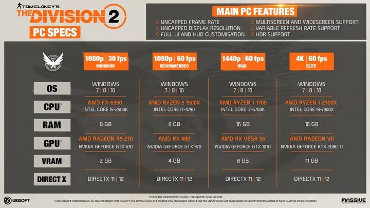 Ubisoft równocześnie ujawnił wymagania sprzętowe gry Tom Clancy’s The Division 2. Poniżej podajemy minimalną i zalecaną specyfikację komputera, a poniżej znajdziecie jeszcze infografikę z dodatkowymi konfiguracjami. Ciekawostką jest umieszczenie świeżo zapowiedzianej karty graficznej Radeon VII obok GeForce’a RTX 2080 Ti w wymaganiach do komfortowej rozgrywki w 4K.