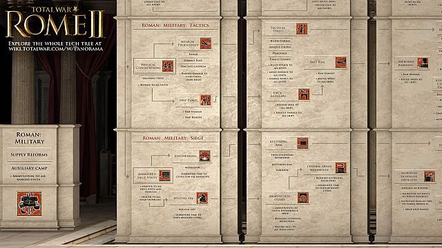 Na Wiki dedykowanej grom z serii Total War umieszczono drzewka rozwoju technologicznego Rzymian w Total War: Rome II. Zobacz, jaka ścieżka prowadzi do odkrycia wież oblężniczych, armii zawodowej czy linii produkcyjnych.