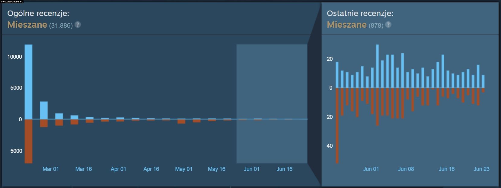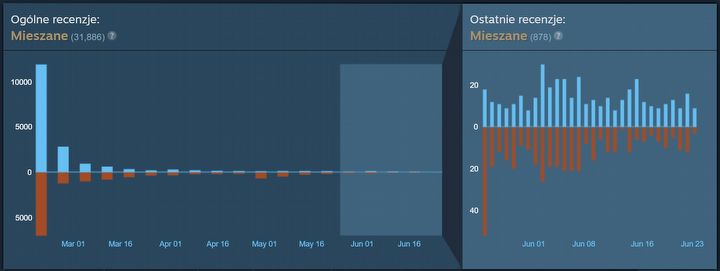 Gracze wydają się względnie pozytywnie oceniać postawę dewelopera i sposób, w jaki naprawia on Total War: Warhammer 3. Za dowód niech posłuży powoli rosnący odsetek pozytywnych recenzji gry na Steamie. Uwzględniając dane z „ostatnich 30 dni”, 7 maja wynosił on 35%, a 17 maja 28%. Dziś natomiast jest równy 52%. Warto jednak wziąć poprawkę na spadającą liczbę recenzji w ogóle, którą dostrzeżecie na poniższym wykresie.