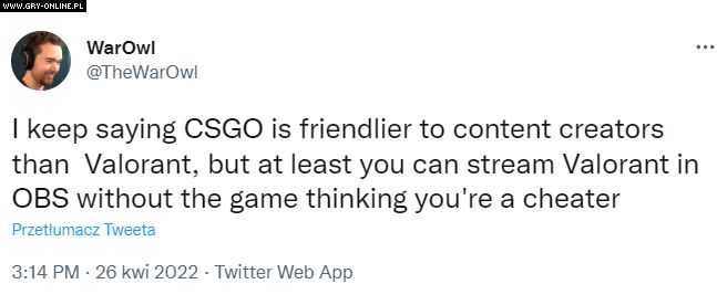 Temat Trybu Zaufania wczoraj za pośrednictwem Twittera podniósł popularny streamer i youtuber TheWarOwl. Stwierdził on, że CS:GO, pomimo bycia bardziej przyjazną grą dla twórców niż konkurencyjny Valorant, ma poważną wadę w postaci Trybu Zaufanego.