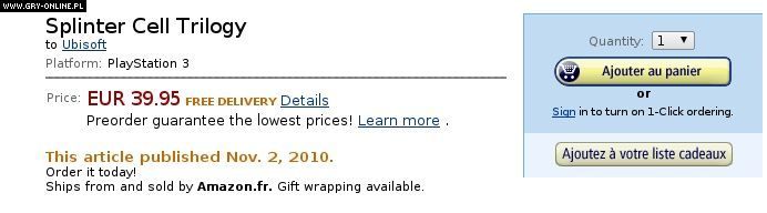 W obu przypadkach dyski Blu-ray z grami kosztować mają niespełna 40 euro (z wliczoną cenę przesyłki na terenie Francji, Szwajcarii i krajów Beneluksu). Szczegółowa zawartość edycji nie została ujawniona, a wspomnianą stronę w internetowym sklepie usunięto dosłownie kilkanaście minut temu. Można więc tylko przypuszczać, że chodzi o zremasterowane gry wydane pierwotnie na konsolę PlayStation 2. Fani Sama Fishera nie mieliby pewnie jednak nic przeciw, gdyby francuski potentat przygotował niespodziankę w postaci Tom Clancy's Splinter Cell: Conviction w wersji na PS3.