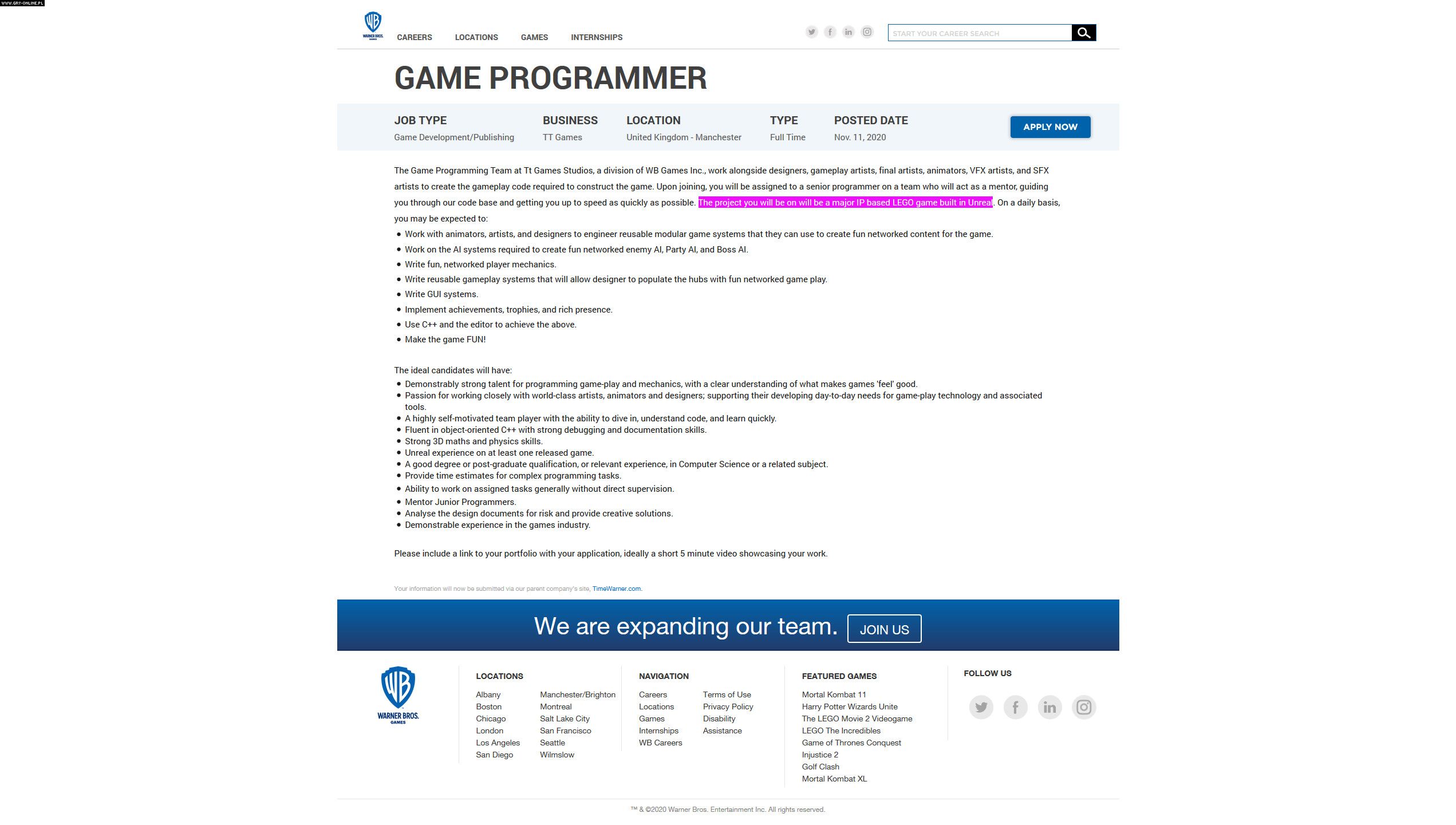 Na oficjalnej stronie Warner Bros. Games pojawiły się ogłoszenia o pracę, wystawione przez należące do firmy studio TT Games. Poszukuje ono programisty i młodszego programisty, którzy ma zajmować się nową grą LEGO opartą na dużej marce.