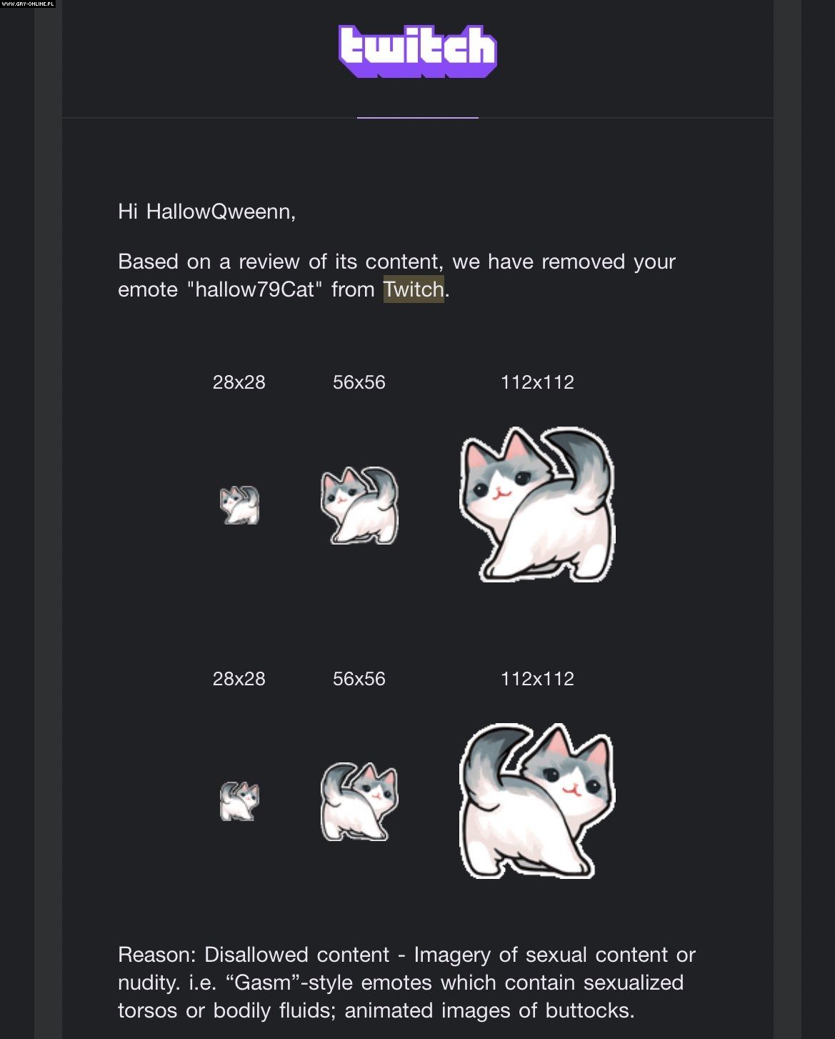 Nie, nie chodzi humanoidalnego kociaka czy inny przykład (nie)popularnej „furry propagandy”. Streamerka HallowQweenn doniosła, że Twitch usunął emotkę z kotem odwróconym tyłem do widzów. Powód? „Wyobrażenia o kontakcie seksualnym lub nagości, […] animowane obrazy pośladków”.