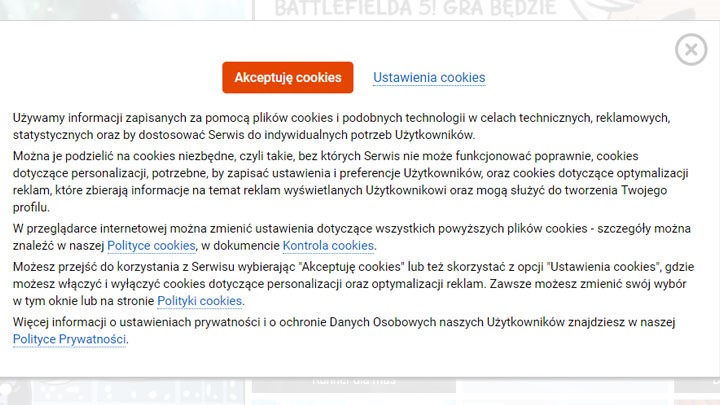 Od dziś wchodząc na GRYOnline.pl, możecie zauważyć okno dotyczące zgód na cookies, z których będzie korzystał nasz serwis. Jeśli zamkniecie to okno, będziemy Wam je pokazywać po każdym przeładowaniu strony do momentu, aż zdecydujecie, co zrobić z ciasteczkami – potrzebujemy Waszej jasnej deklaracji w tym zakresie. Możecie zaakceptować je wszystkie, wybierając „Akceptuję cookies”, lub wybrać, z których cookies chcesz korzystać po kliknięciu w „Ustawienia cookies”.