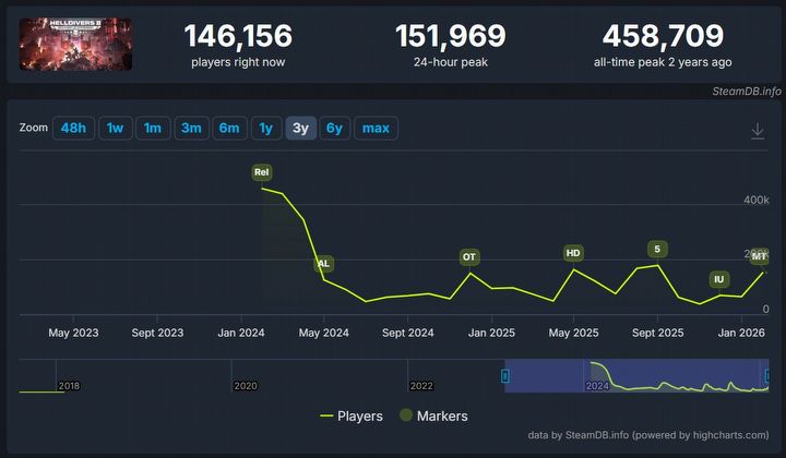 Nowe misje, cele oraz utrudnienia zapewniły Helldivers 2 spory zastrzyk popularności, dzięki czemu tytuł jednocześnie przyciągnął przed ekrany ponad 150 tysięcy użytkowników Steama. Co prawda to jeszcze nie wynik na miarę poprzednich dużych aktualizacji, ale wciąż mówimy o wzroście „peaku” z około 40-60 tysięcy graczy od początku 2026 roku.