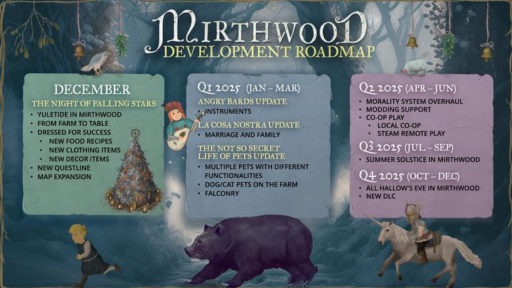 Prócz tego zespół Bad Ridge Games udostępnił „mapę drogową” Mirthwood, pokrywającą okres aż do końca 2025 roku. Grafikę udostępnioną na Steamie zamieściliśmy poniżej.
