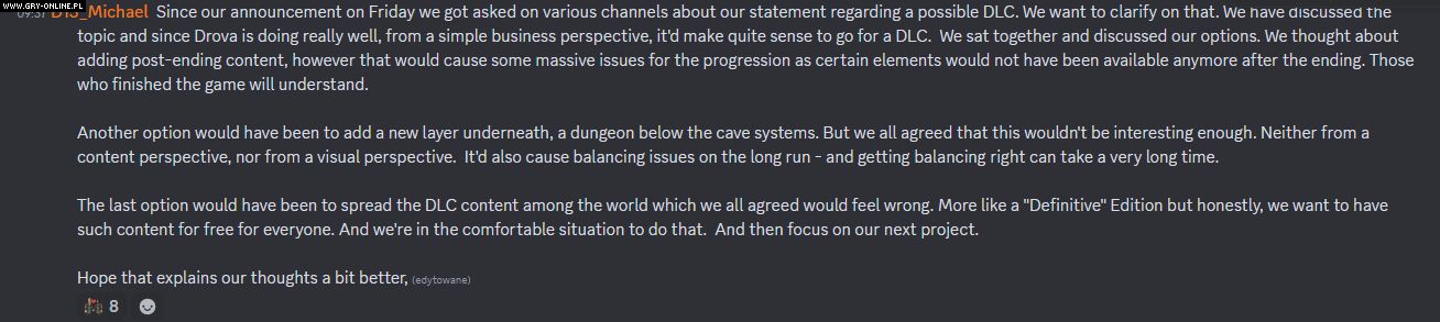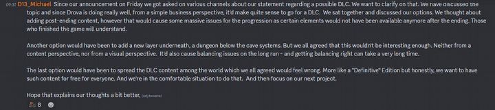 Omówiliśmy ten temat i ponieważ Drova: Forsaken Kin radzi sobie naprawdę dobrze, z prostego biznesowego punktu widzenia, całkiem sensowne byłoby stworzenie DLC. Usiedliśmy razem i omówiliśmy nasze opcje. Myśleliśmy o dodaniu zawartości dostępnej po zakończeniu, jednak spowodowałoby to ogromne problemy z postępem, ponieważ pewne elementy nie byłyby już wtedy dostępne. Ci, którzy ukończyli grę, zrozumieją. Inną opcją było dodanie nowej warstwy, lochu pod systemami jaskiń. Jednak wszyscy zgodziliśmy się, że to nie byłoby wystarczająco interesujące. Ani pod względem merytorycznym, ani wizualnym – czytamy we wpisie na Discordzie.