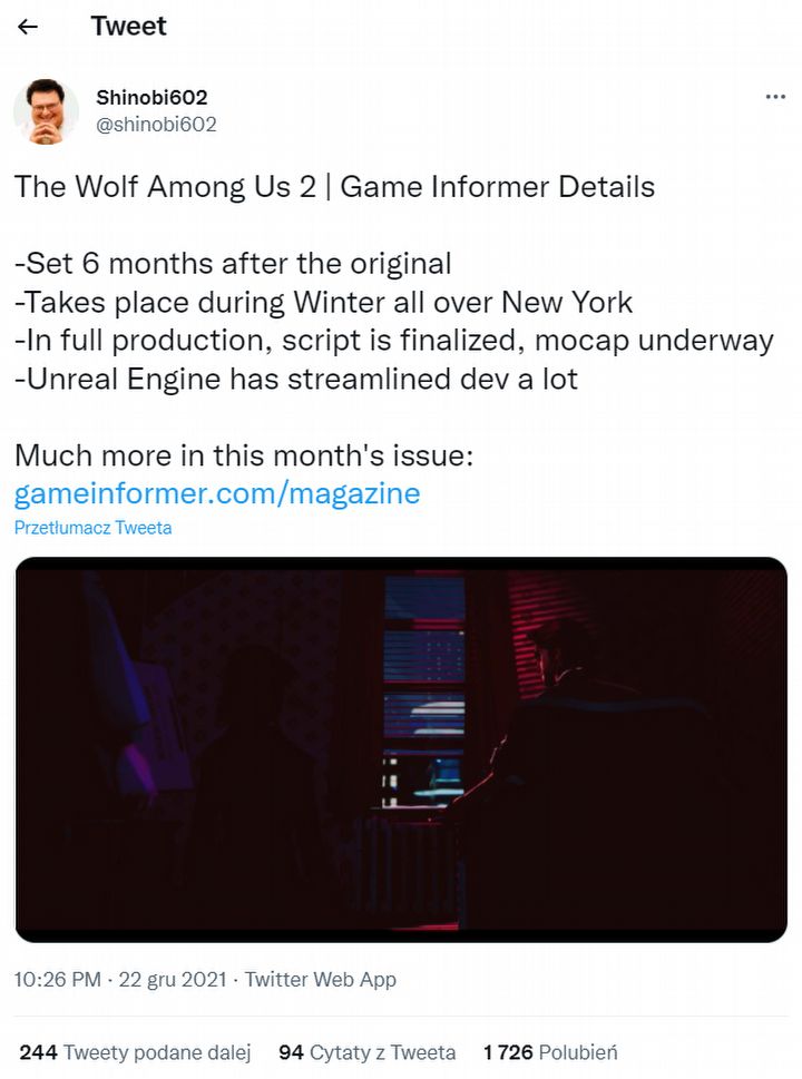 Ta informacja powinna nieco uspokoić fanów: gra znajduje się w „pełnej produkcji”, a prace nad scenariuszem (który jest w tym przypadku kluczowy) zostały zakończone. Poznaliśmy też nieco szczegółów technologicznych – The Wolf Among Us 2 podobno będzie oparte o graficzny silnik Unreal Engine, co jest odstępstwem, jeśli chodzi o produkcje Telltale, które dotychczas korzystały z autorskiej technologii.