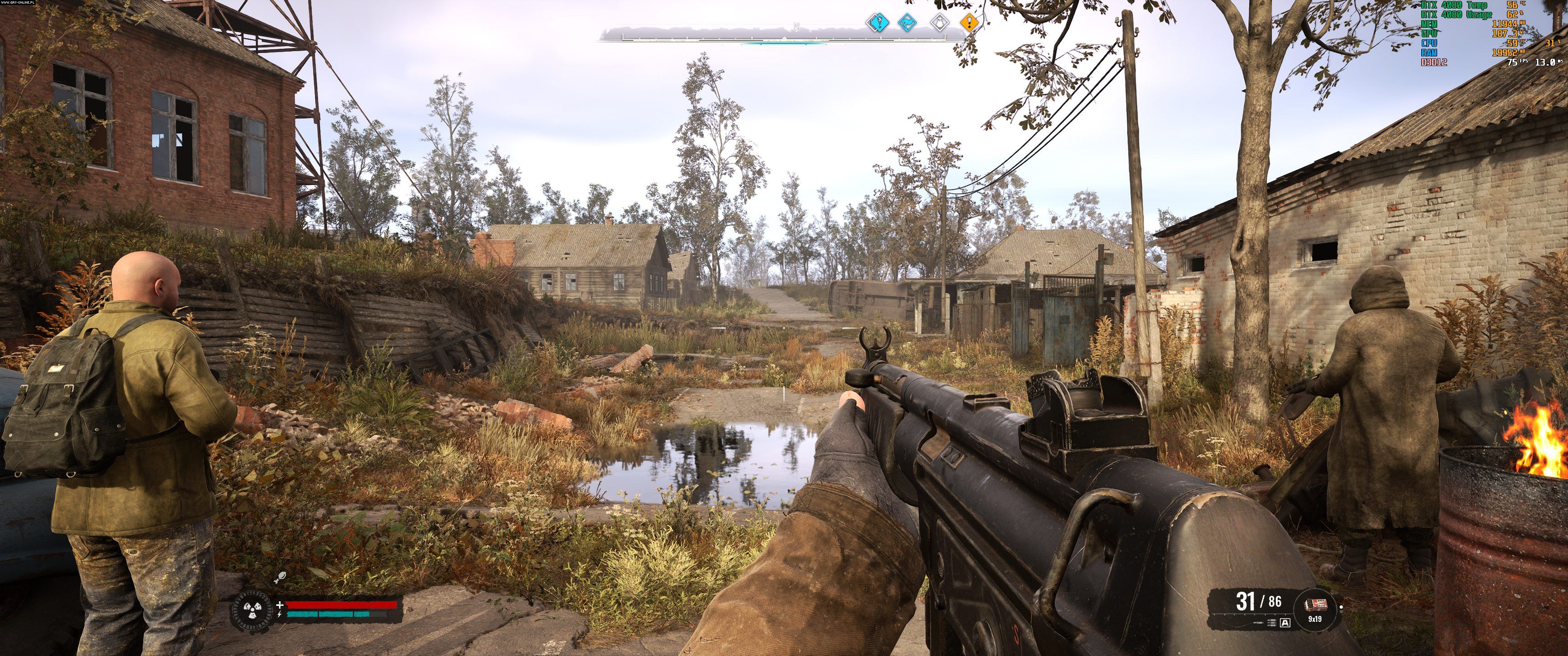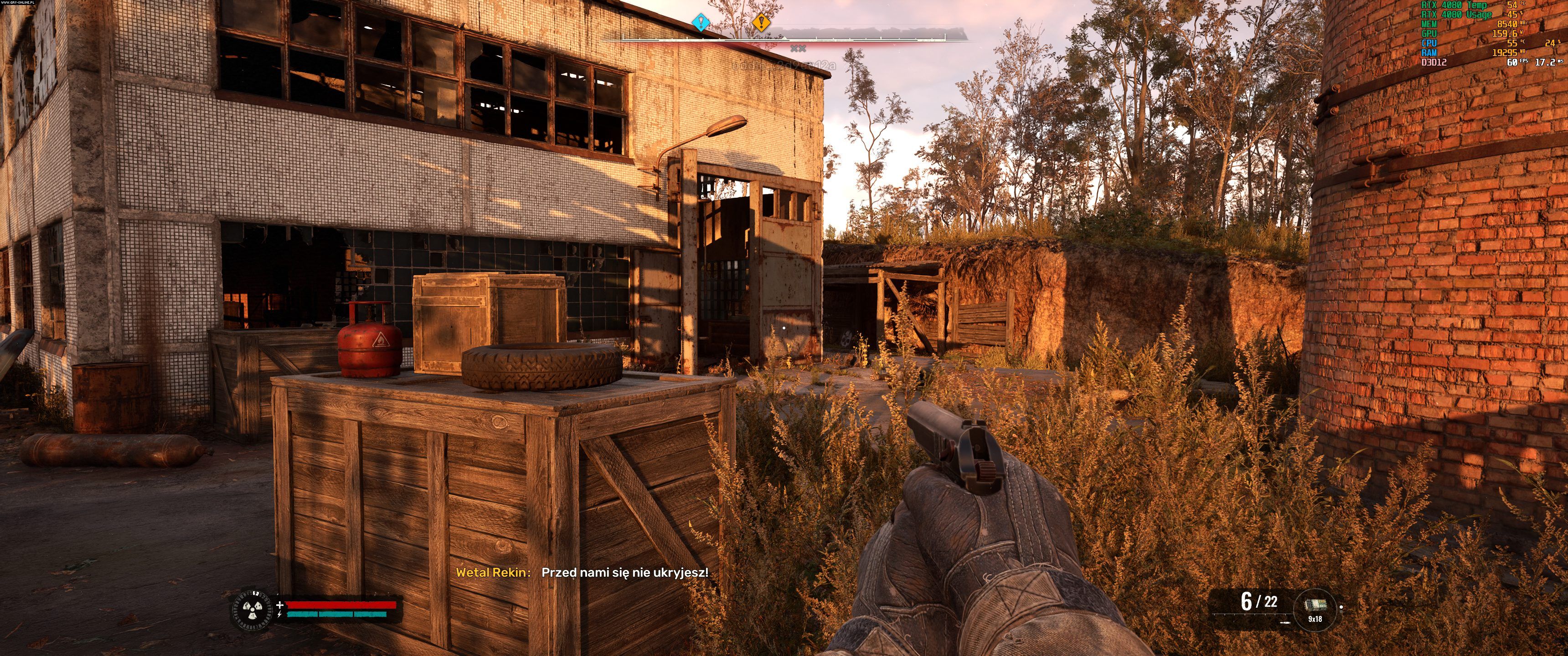 Po wyjściu w otwarty teren sytuacja się nieco uspokoiła, a licznik fpsów dość mocno fluktuował, pokazując od 60 do nawet 80 klatek na sekundę. Kiepsko było, kiedy spotkałem pierwszych NPC-ów i grupkę wrogów, bo wtedy STALKER 2 zaczął raczyć mnie ścinkami, takimi dosłownie na ułamek sekundy, ale chyba nie muszę tłumaczyć, jak bardzo są one irytujące.