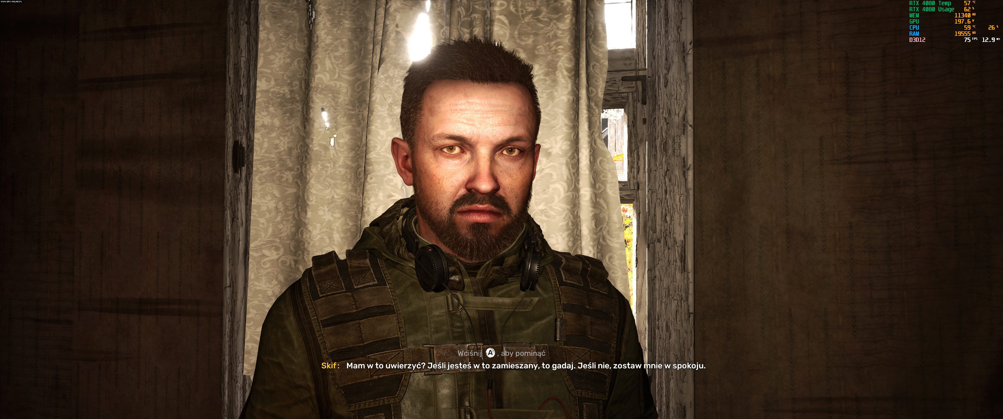 Grę S.T.A.L.K.E.R. 2: Heart of Chornobyl testowałem na pececie wyposażonym w procesor Intel Core i5-13600K, kartę graficzną Gigabyte NVIDIA GeForce RTX 4080 SUPER AERO OC (16 GB VRAM) oraz 32GB pamięci RAM. W teorii mój pecet powinien spełniać najwyższe wymagania (Epickie), no może być delikatnie ograniczonym przez procesor, bo i7-13700KF to jednak nieco wydajniejsza jednostka. Zamiast podanej przez deweloperów rozdzielczości 4K, u mnie gra działała w 1440p, więc teoretycznie karta graficzna powinna mieć też nieco lżej niż przewidują wymagania.