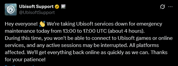 Gracze planujący popołudniową sesję z grami Ubisoftu muszą uzbroić się w cierpliwość, ponieważ firma ogłosiła nagłą, czterogodzinną przerwę techniczną obejmującą wszystkie tytuły i platformy sprzętowe.