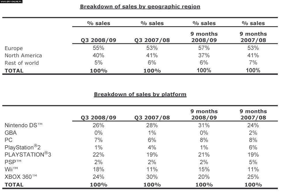 Wydawca przewiduje, że w okresie od stycznia do marca tego roku uzyska przychody wysokości od około 275 milionów do 304 milionów dolarów, czyli o kilka procent mniej niż za ten sam okres w zeszłym roku. Cały rok fiskalny 2009-2010 ma przynieść natomiast przychody ze sprzedaży równe mniej więcej 1,5 miliarda dolarów. Co ciekawe, bardzo ważnym segmentem dla Ubisoftu są konsole firmy Nintendo. W minionym okresie świątecznym 44% sprzedażnych gier korporacji zostało wydanych właśnie na Wii i DS-a (szczegółowe informacje na powyższym wykresie).