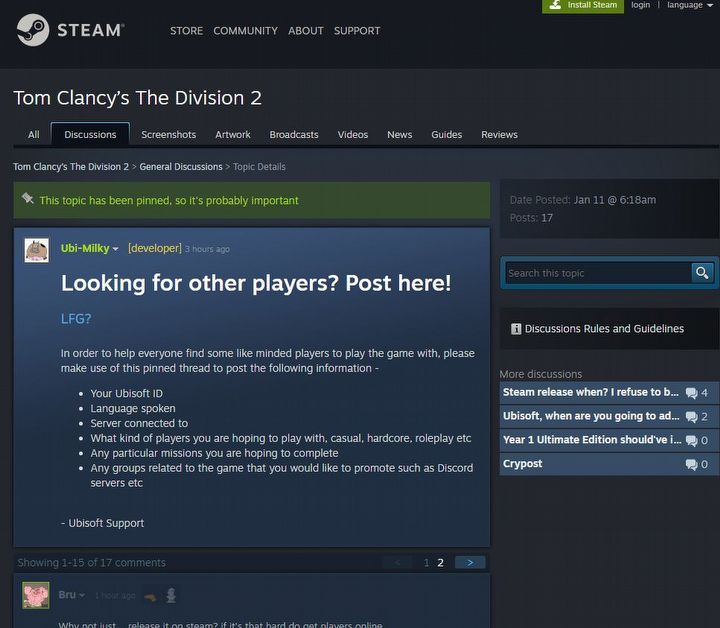 Ubi-Milky, bo takaż nazwa użytkownika dewelopera, zachęcał do dzielenia się swoimi nickami z Ubisoftu i indywidualnymi preferencjami co do gry, i umawiania się z innymi ludźmi korzystającymi ze Steama na wspólne posiedzenia przy Tom Clancy’s The Division 2. Fanom bardzo nie spodobał się fakt wykorzystywania tej platformy do promowania niedostępnego na niej produktu, a więc po serii krytycznych komentarzy post został usunięty. W Internecie jednak nic nigdy nie ginie, a więc dowód zbrodni znajdziecie poniżej.