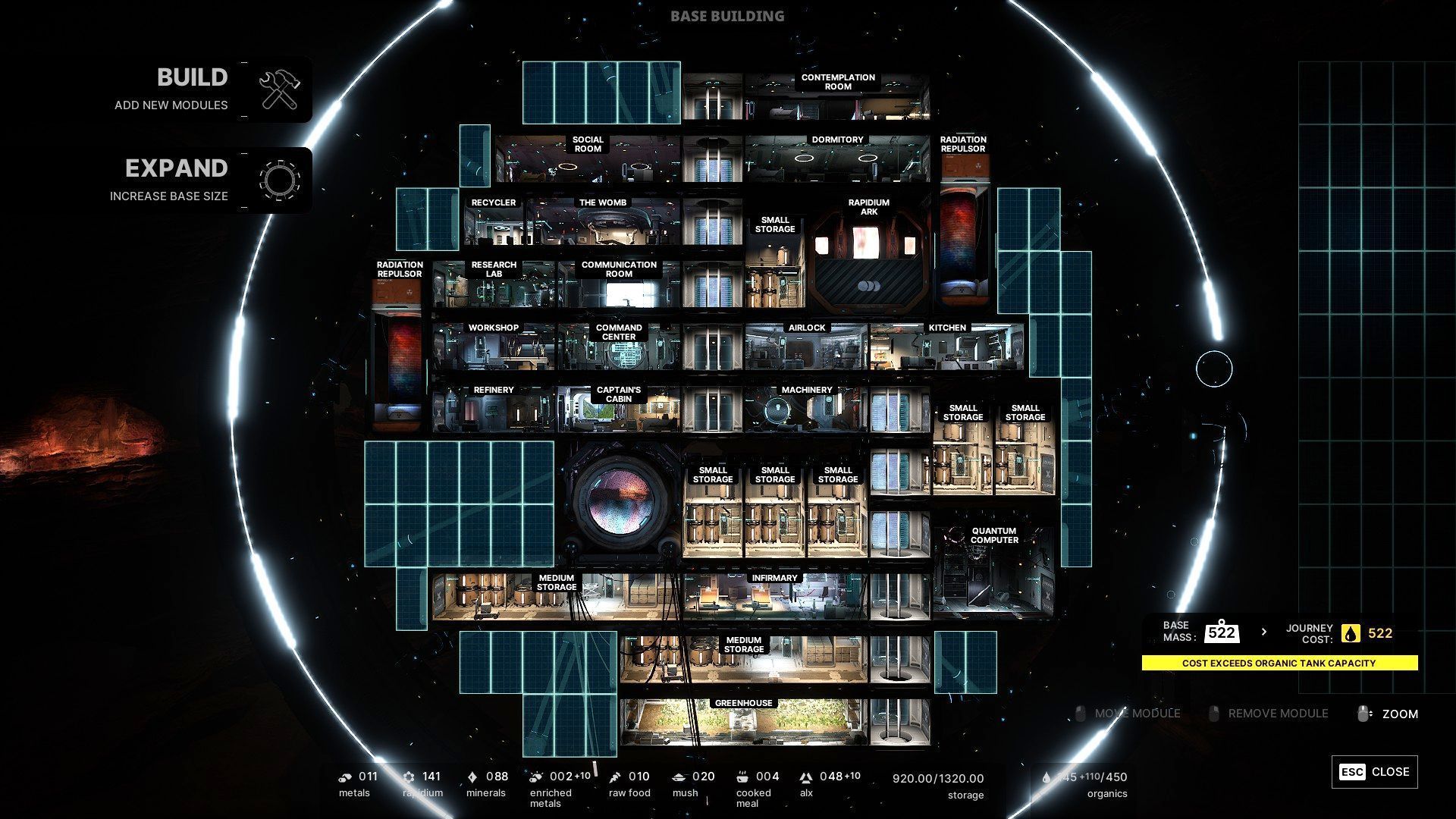 Jak wspominaliśmy na wstępie, gra pozwala nam dowolnie zmieniać układ pomieszczeń w bazie – jedynym wyjątkiem jest oczywiście jej rdzeń. Kombinowanie z architekturą nic nas tutaj nie kosztuje, zwłaszcza jeśli weźmiemy pod uwagę możliwość jej rozszerzania wraz z postępem fabuły. Istotnym aspektem jest masa bazy, która może uniemożliwić nam ukończenie ostatniego aktu – wystarczy, że przypilnujemy zebranych zapasów substancji organicznych.