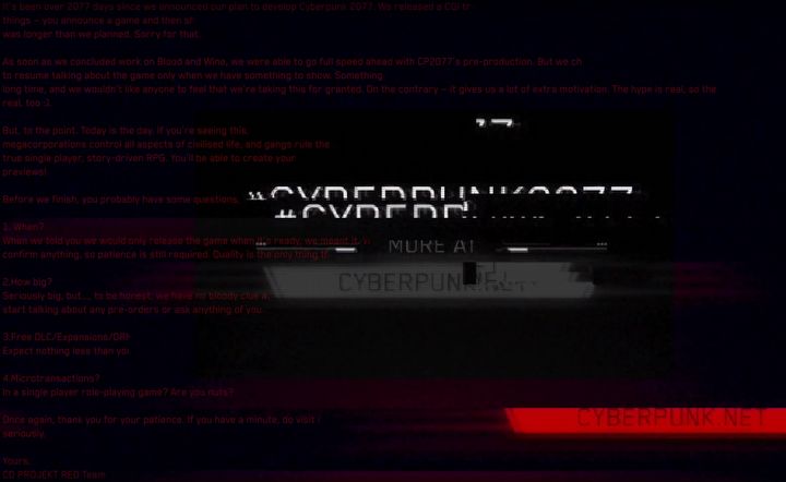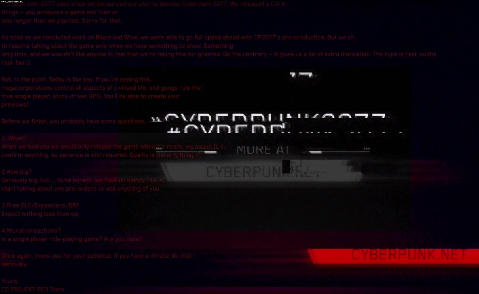Dalej autorzy przechodzą do sedna, dzieląc się informacjami na temat świata gry. Cyberpunk 2077 zabierze nas w podróż do futurystycznej wersji Ameryki znajdującej się w rękach megakorporacji kontrolujących wszelkie aspekty życia obywateli tego kraju; tam, gdzie nie sięgną ich wpływy, będą natomiast rządzić gangi. Studio przekonuje, że choć świat gry jest napędzany przez adrenalinę, miłośnicy pełnokrwistych RPG-ów nie powinni dać się nabrać na widoczne na zwiastunie pościgi czy wszechobecne giwery; Cyberpunk 2077 będzie bowiem pełnoprawnym przedstawicielem gatunku, w którym pierwsze skrzypce odegra historia. Przed rozpoczęciem zabawy stworzymy nawet własnego protagonistę… i w tym momencie komunikat się urywa, ustępując miejsca potwierdzeniu, że omawiany tytuł będzie prezentowany przez firmę na targach E3, więc fani mogą liczyć na szczegółowe zapowiedzi.