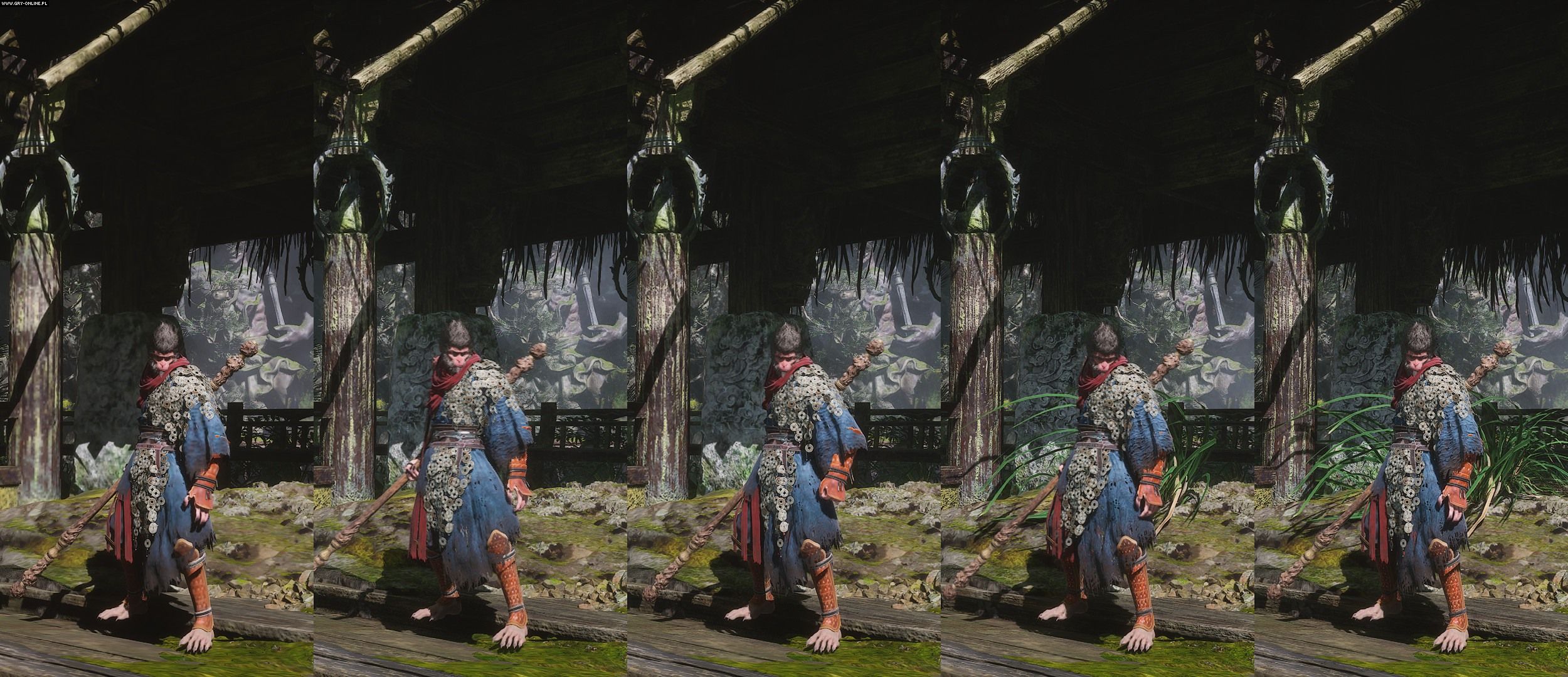 Porównanie dostępnych opcji graficznych. Od lewej: niskie, średnie, wysokie, bardzo wysokie i filmowe. Warto zwrócić uwagę na roślinność, której robi się znacznie więcej na wyższych ustawieniach.Źródło: Black Myth: Wukong, Game Science.