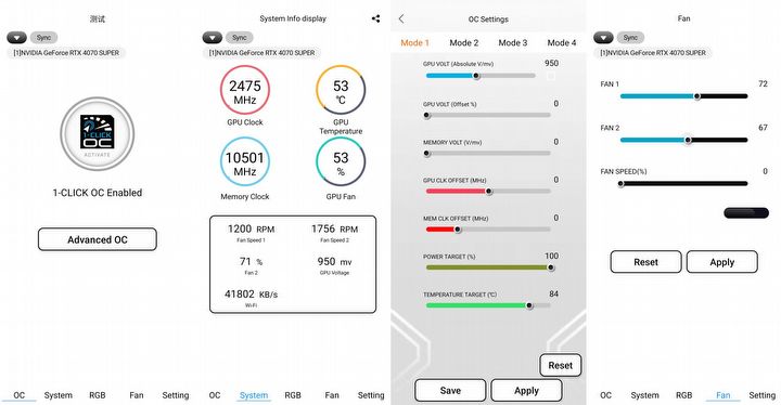 Apki mobilne to zdecydowanie rzadsze rozwiązanie – w przypadku KFA2 dostajemy całkiem sporo narzędzi, które umożliwią kontrolę wentylatorów, łatwe zwiększanie wydajności czy podejrzenie parametrów karty. Może się przydać, jeśli nie chcemy używać różnego rodzaju nakładek na gry z danymi, przełączać się między aplikacjami w czasie rozgrywki i nie mamy dwóch monitorów.