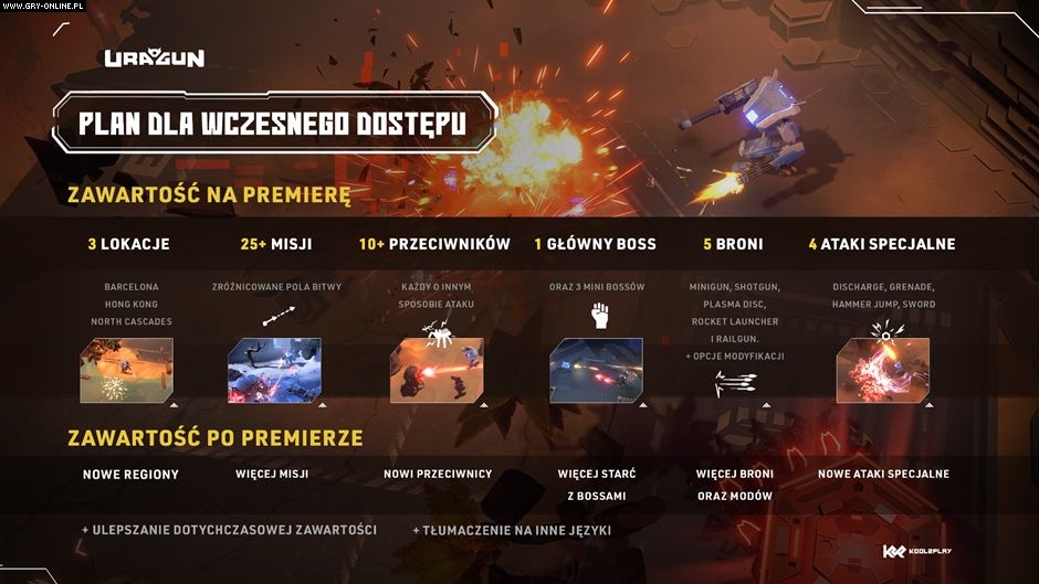 Gra oferuje system rozwoju Mecha, kilka rodzajów broni (strzelby, karabiny automatyczne, plazmowe bumerangi). We wczesnym dostępie spróbujemy swoich sił w 25 misjach oraz zmierzymy się z ponad 10 zróżnicowanymi przeciwnikami i bossami. Twórcy zaznaczają, że gra będzie systematycznie rozwijana. Spodziewajmy się więc dodatkowych wrogów, zadań i lokacji, które będą dodawane aż do premiery pełnej wersji. Uragun możecie zakupić poprzez Steam za 59,99 zł.