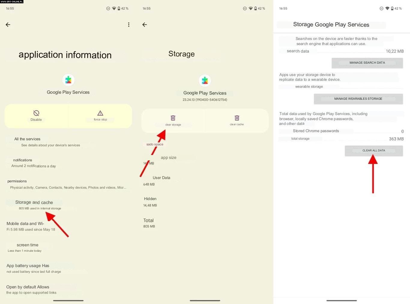 Innym z pomysłów jest wyczyszczenie pamięci podręcznej aplikacji. Możemy to zrobić w zakładce „Aplikacje”, klikając na „Przechowywanie”, a następnie „Zarządzanie przestrzenią” (nazewnictwo opcji może zmienić się w zależności od posiadanego przez nas modelu i nakładki systemowej). Tam wyczyścimy wszystkie dane, ale nie musimy się obawiać bezpowrotnej ich utraty. Zostaną ponownie zsynchronizowane z Google.