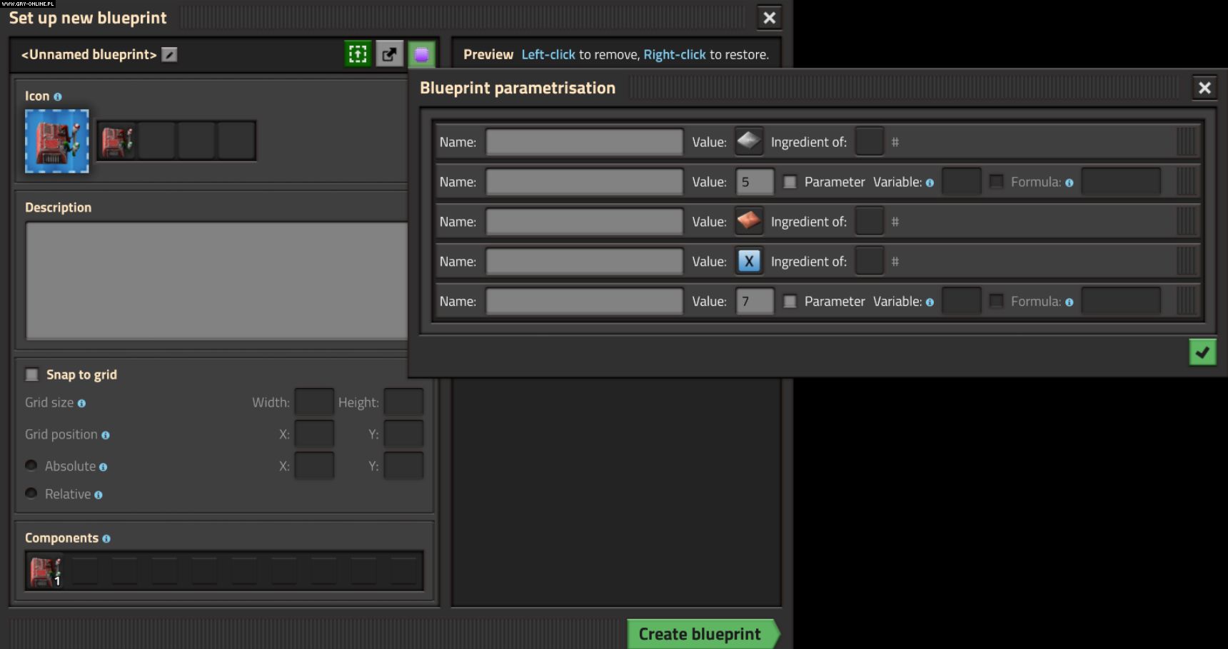 Parametryzowane schematy nie będą miały określonej konfiguracji przedmiotu. Zamiast tego mają funkcjonować jako ogólna formuła, dla której gracze mogą określić serię wstępnie ustawionych parametrów. Za każdym razem, gdy zdecydujemy się użyć danego z zapisanych planów, na ekranie pojawi się okno ze szczegółami do ustalenia.