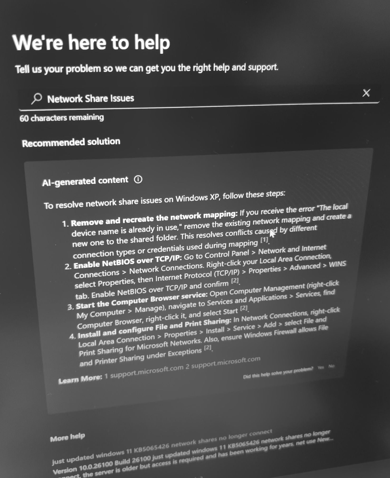 Nietypowa sytuacja jest prawdopodobnie związana z halucynacjami AI, które nie rozumie kontekstu i ważniejsze są słowa kluczowe. W wyszukiwarce nad poradami widać zdanie „Network Share Issues”, które Copilot mógł powiązać z licznymi problemami dotyczącymi w przeszłości Windowsa XP i sztuczna inteligencja założyła, że użytkownik zajmuje się teraz komputerem z ponad 20-letnim systemem operacyjnym.