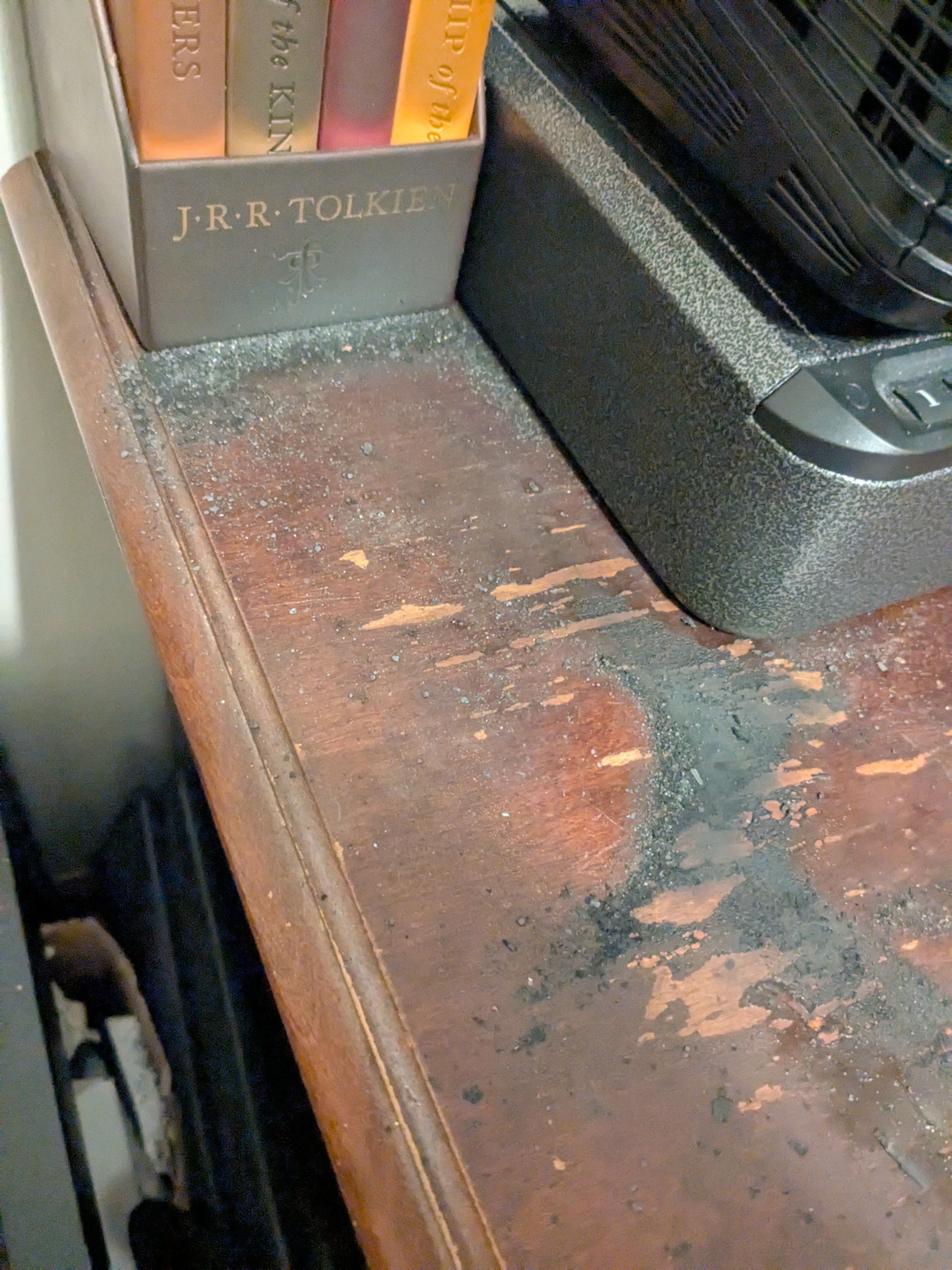 Na dowód całego zdarzenia użytkownik udostępnił folder na Dysku Google (cóż za ironia), w którym pokazał zniszczony telefon oraz okopconą szafkę nocną.