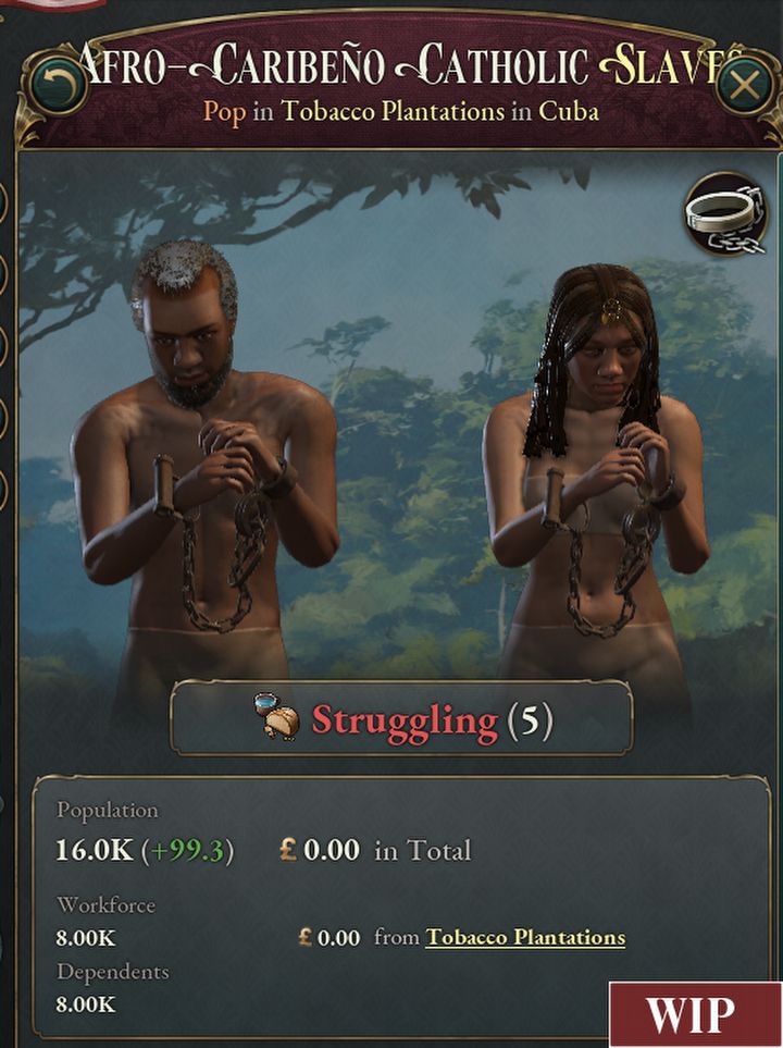 Poprzez nasz system Pop staramy się reprezentować każdego człowieka na planecie od 1836 roku, więc co byśmy zrobili, gdybyśmy po prostu wypisali wszystkie zniewolone jednostki z historii, lub zredukowali je do abstrakcyjnego zestawu modyfikatorów?